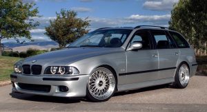 The car is finished in Titanium Silver over black leather interior and features a front bumper from the E39 M5, complete with M5 brackets, ducts, and fender liners, and an M-Tech-style rear bumper. The BBS Super RS wheels measure 19 inches in diameter and 9 inches wide at the front and 10 inches at the rear.