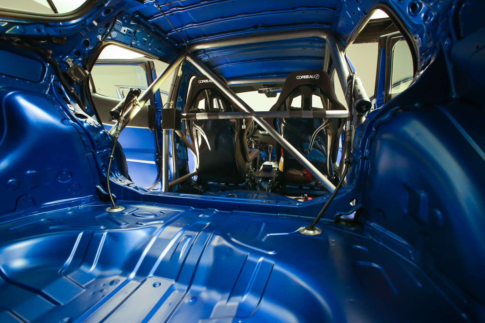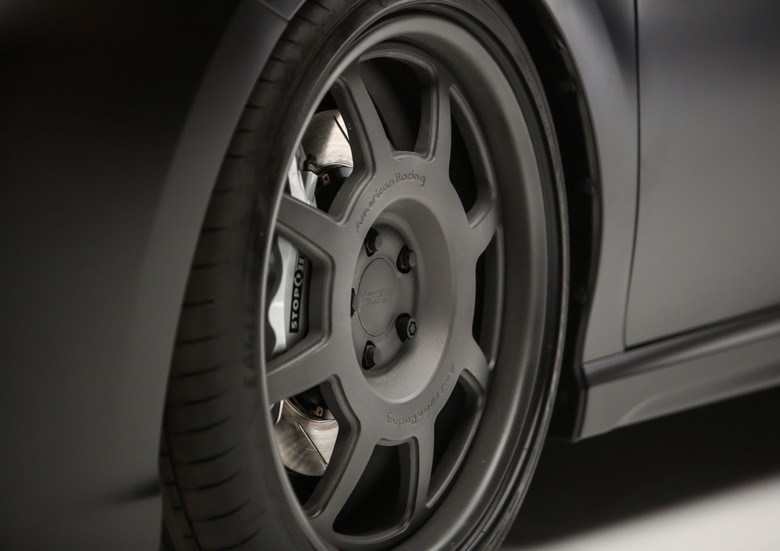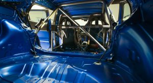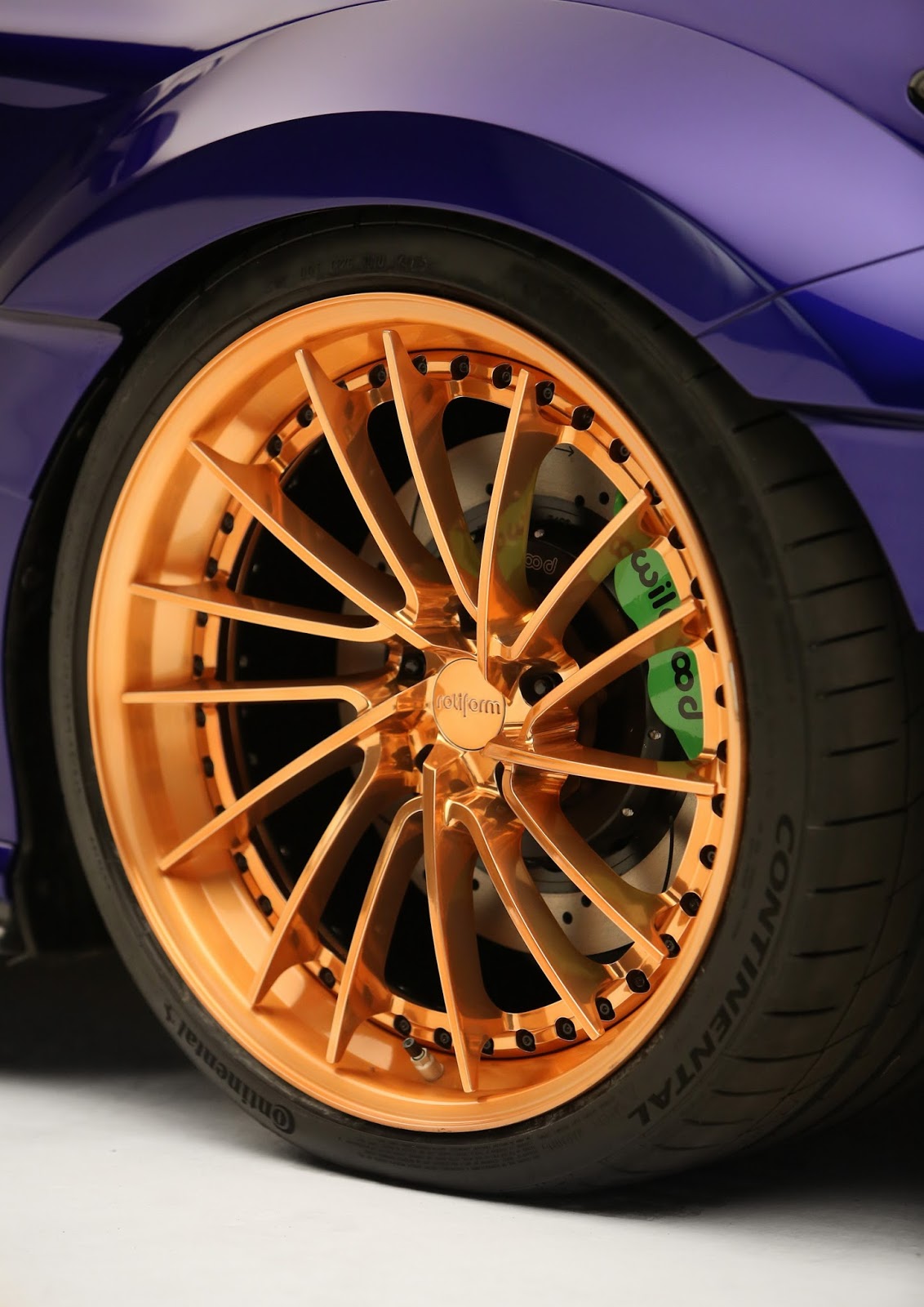 The car’s custom body panels were created using 3D-printing technology, making the hood, front and rear bumpers, rocker panels, rear diffuser and headlight buckets completely unique to this car. Once the multi-piece widebody kit went on, the car was painted with a custom color named “Blurple” and lowered on top of the 20″ Rotiform alloy wheels.