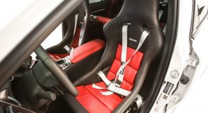 As you can see, the dual-tone color scheme features a pearl-white body with contrasting black roof and A-pillars. Carbon fiber components were also strategically placed in order to drop some weight. Similarly to Truex Jr, Suarez also added a front splitter and a rear wing in order to produce usable downforce. He then went with a custom hood with aluminum ductwork, and leather upholstery for the interior, featuring the driver’s signature stitched in red.