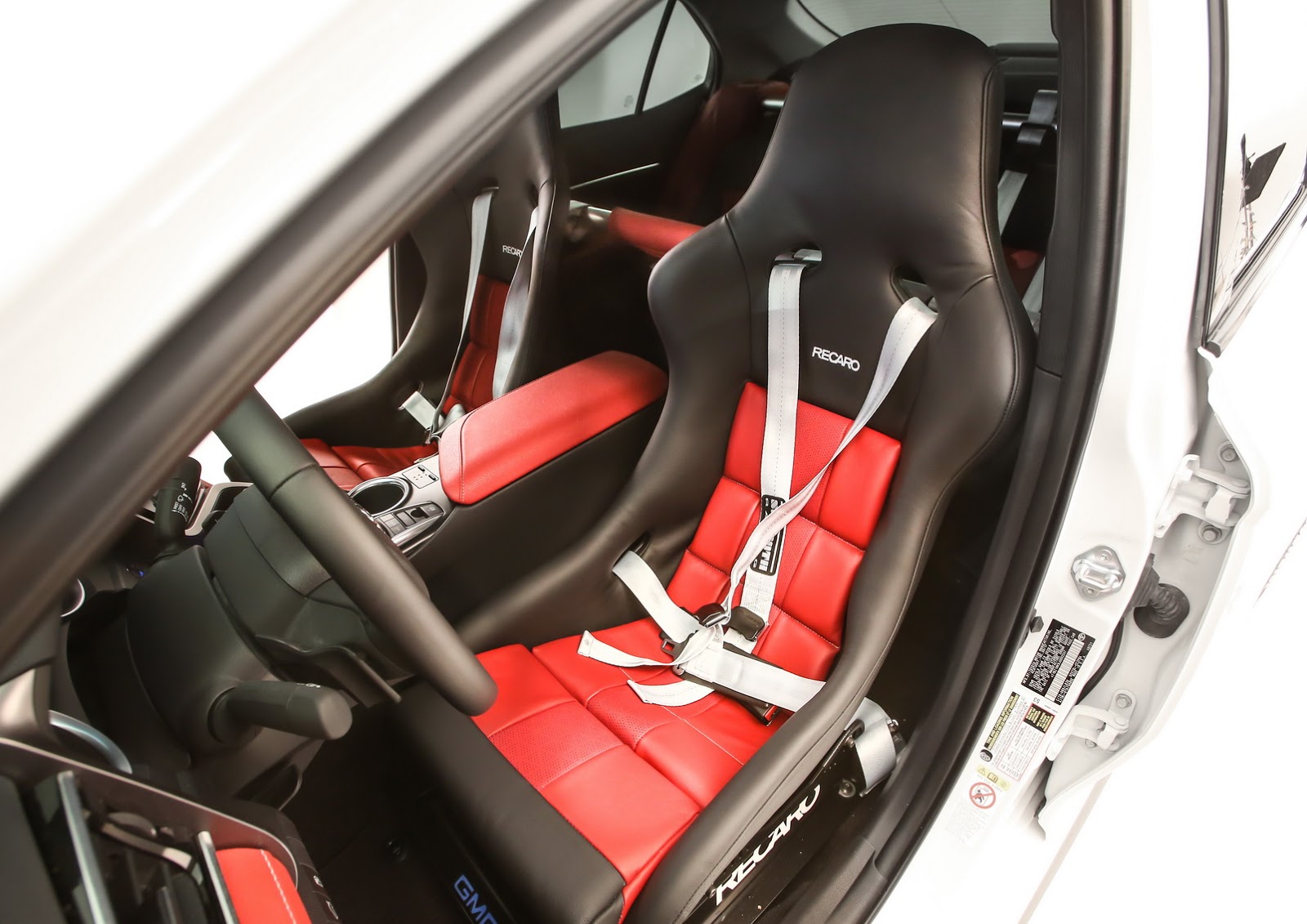 Hamlin’s idea of a sporty Camry is something that would feel at home at Virginia International Raceway, while allowing you to drive it away comfortably after you’re done having fun. It features a widebody conversion with 3-inch fender flares, big 20×10-inch wheels, a white and black exterior, plus red chrome and black accents inside, to go with the black leather on the Recaro bucket seats.