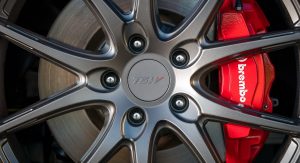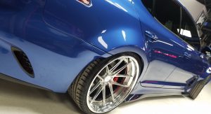 Inside, there’s custom blue leather seat piping, a hand-stitched gray leather dash panel, an Alcantara-wrapped steering wheel and gloss black center console trim.
