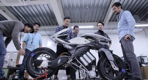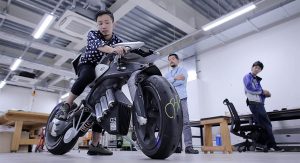 For starters, the slim bike is entirely electric, with hub motor in the rear wheel (not in the body), juiced by a lithium-ion battery pack. The impressive part, however, stems from its Artificial Intelligence system, which can recognize the rider and his (or her) commands, rise up from its kick-stand, wheel over to the rider, and take him for a ride.