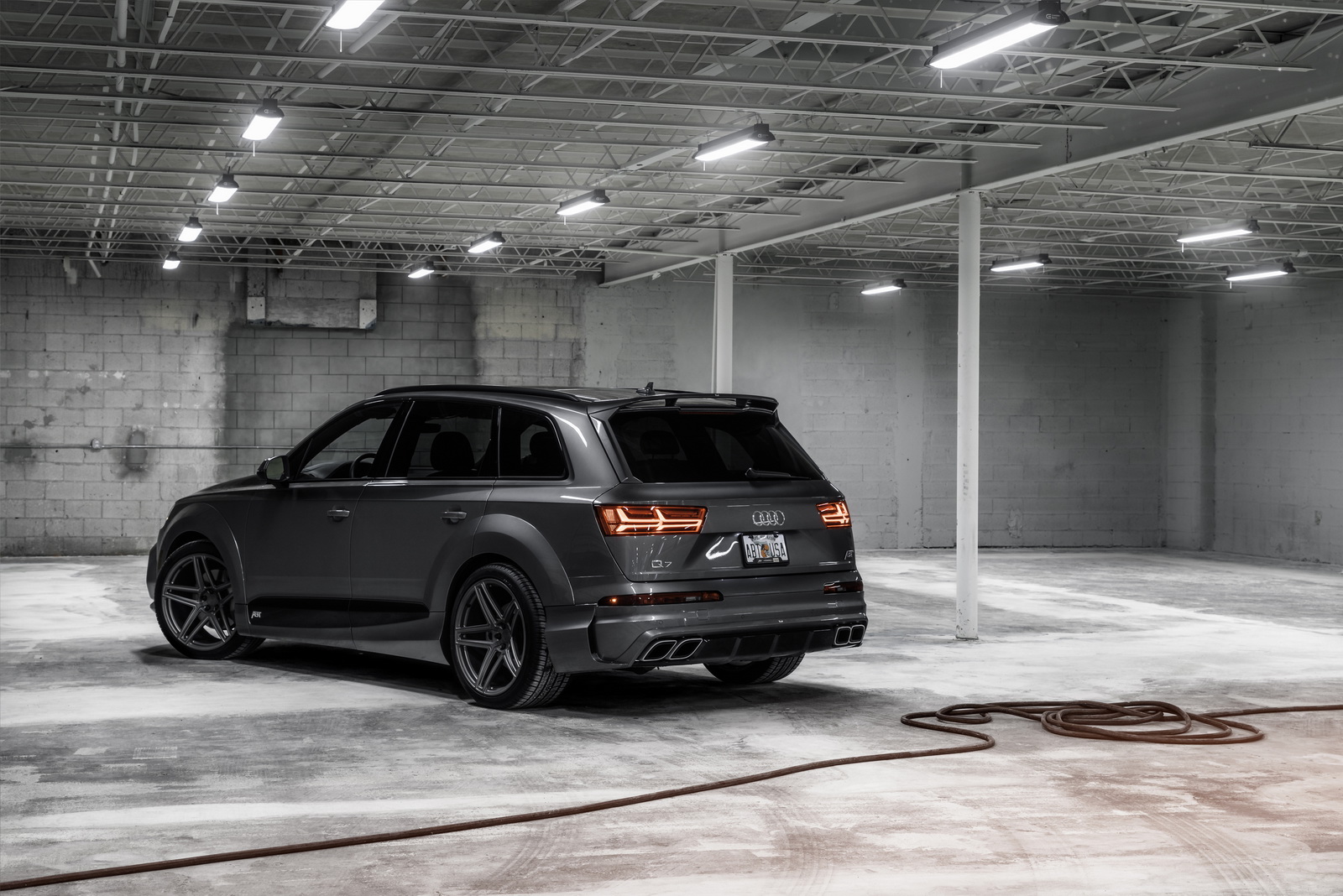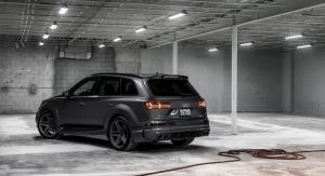 Changes compared to stock Audi Q7 models include the front skirt, fender extensions, rear diffuser with special muffler and pipes, and roof-mounted spoiler. The SUV also gets a few carbon fiber parts on the grille, front lip, and rear skirt.