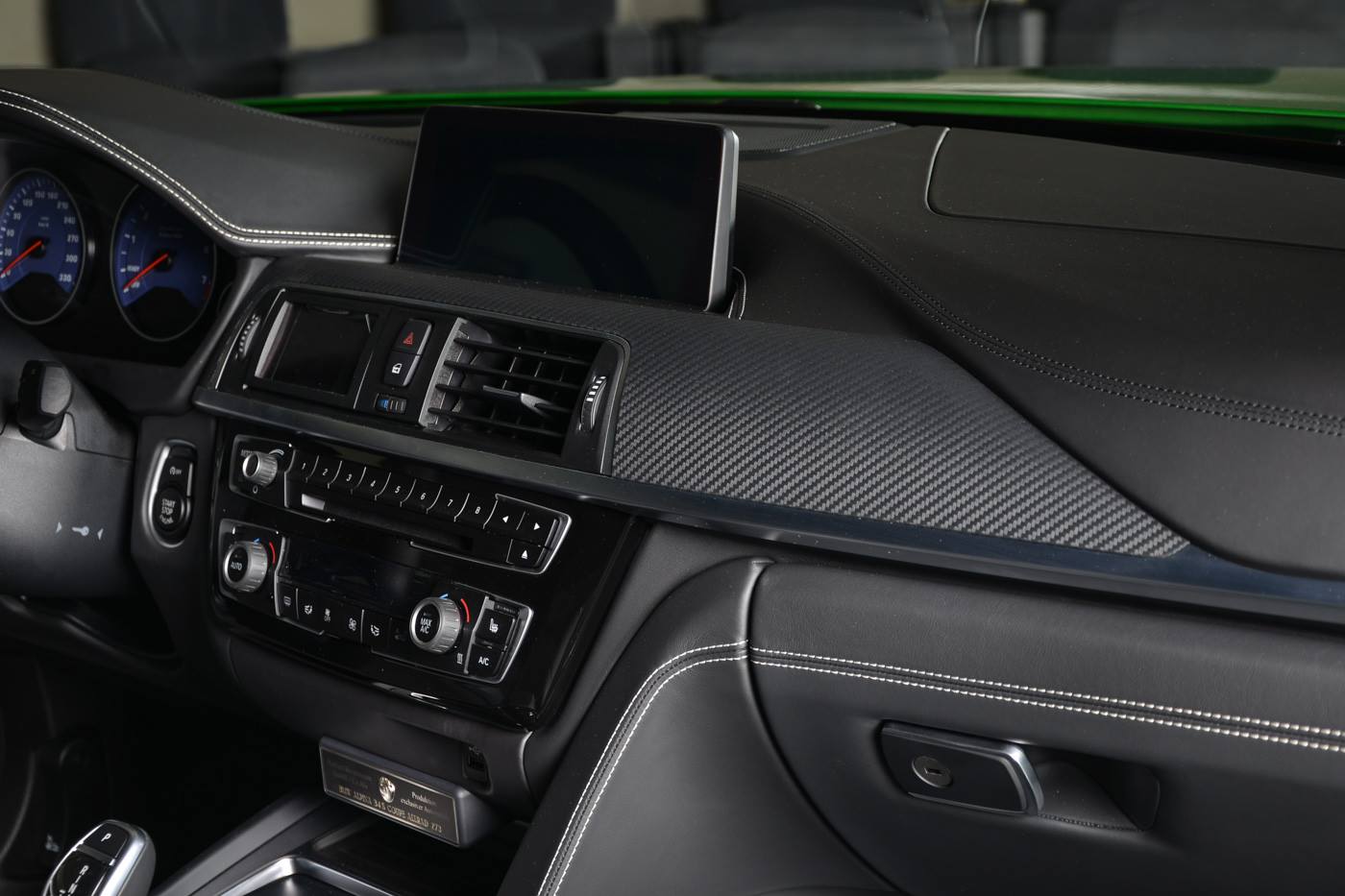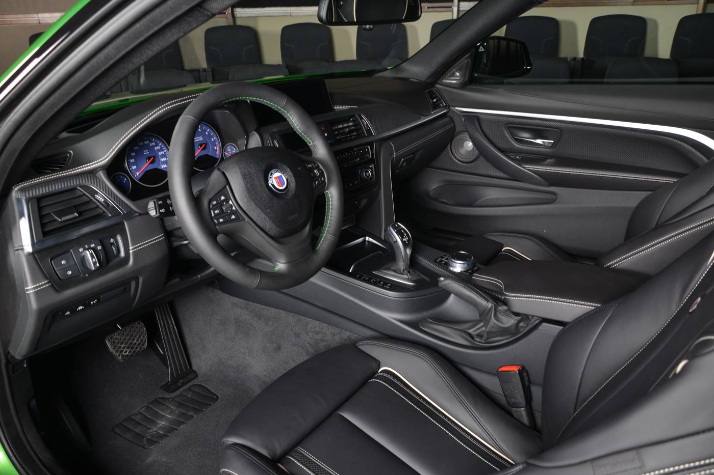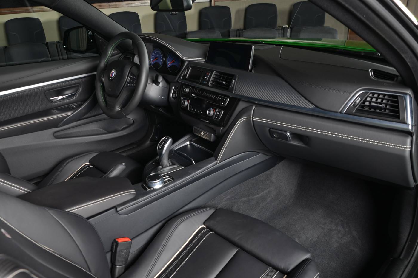 Building upon the latest Alpina B4 S Bi-Turbo, the car on display at Abu Dhabi has been fitted with a very specific body kit, whicn includes a front splitter and a boot lid spoiler. Everything was painted in Rallye Green, and this premium compact coupe also benefits from the tuner’s multi-spoke alloy wheels and a set of blue calipers.
