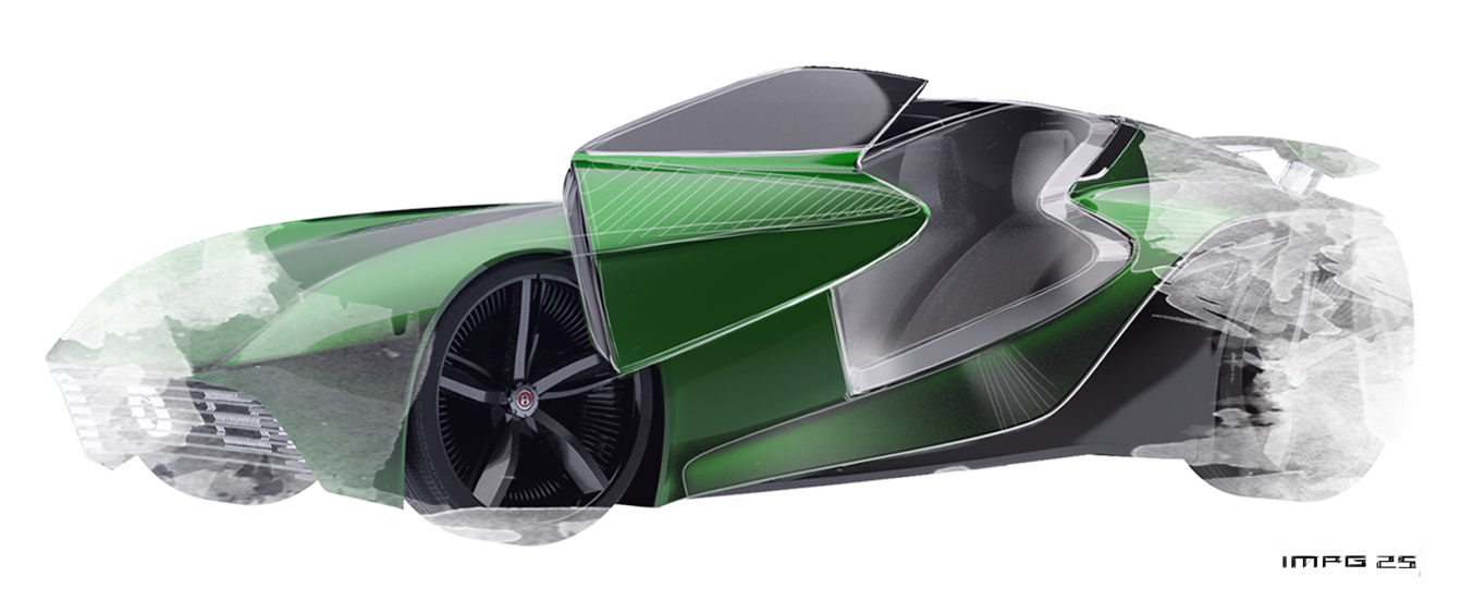 Unfortunately the cabin itself didn’t get sketched, but we can see the seats inside, thanks to those forward-sliding doors being open in one of the images.