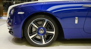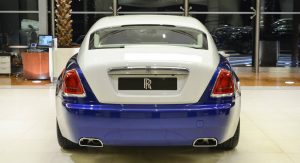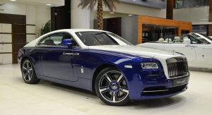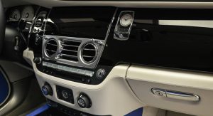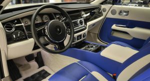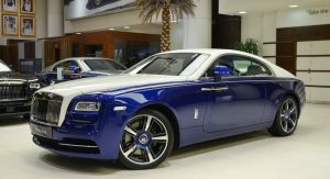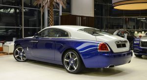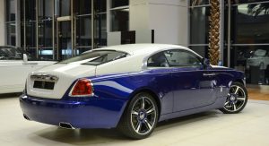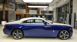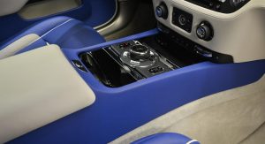This Wraith, pictured here at Rolls-Royce Motor Cars in Abu Dhabi, is wearing a Salamanca Blue with English White body, while the interior has been adorned in Cobalto Blue with a Seashell contrast.