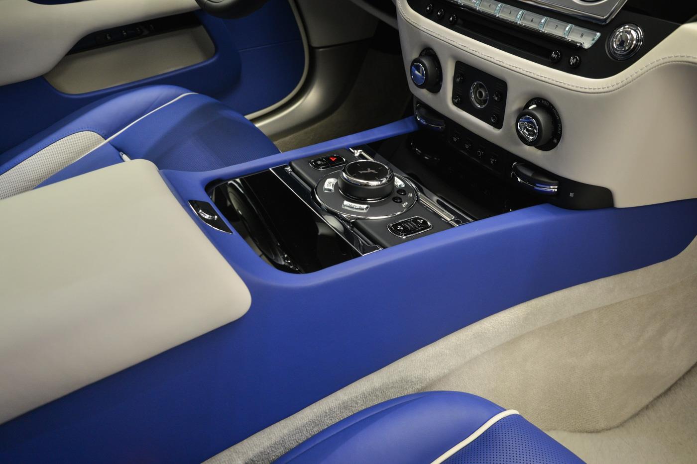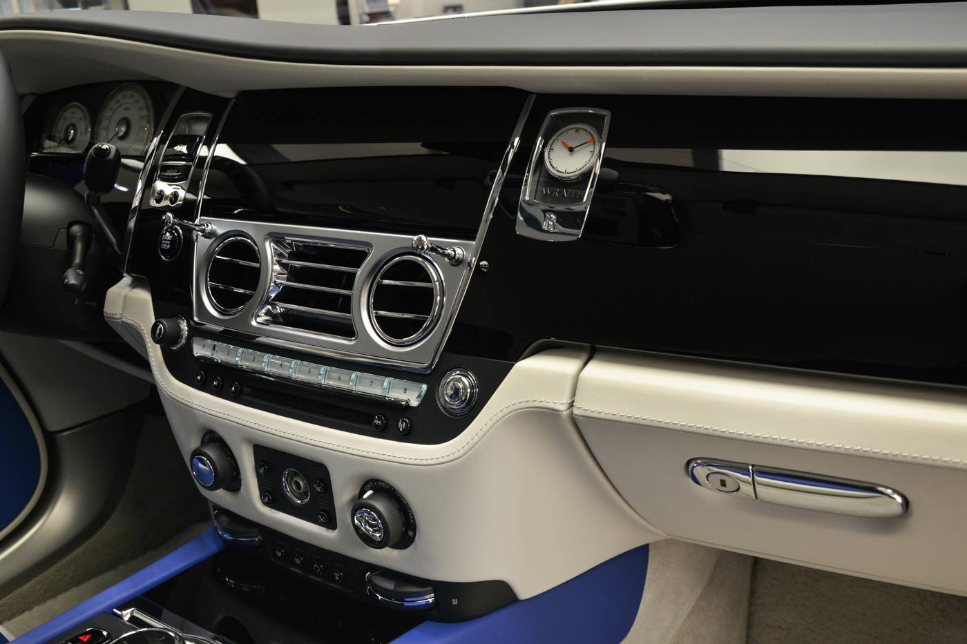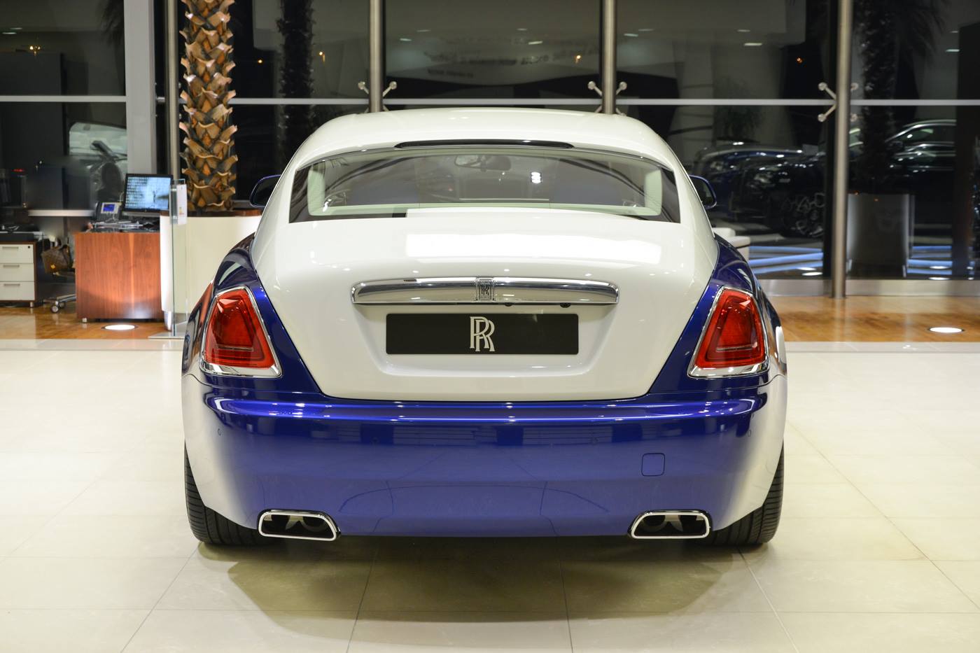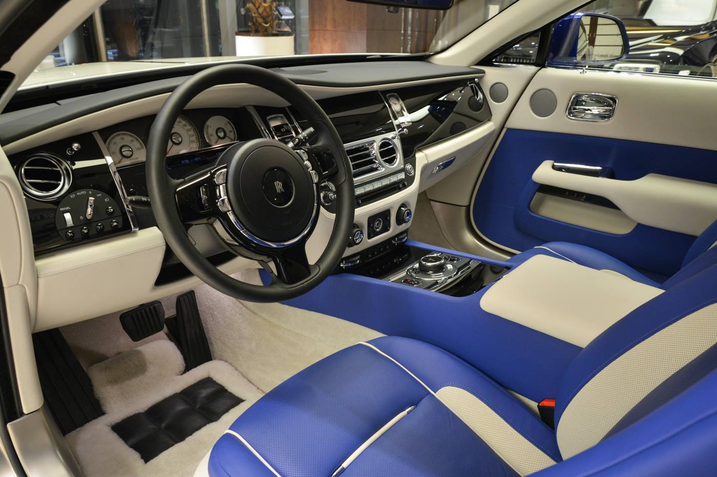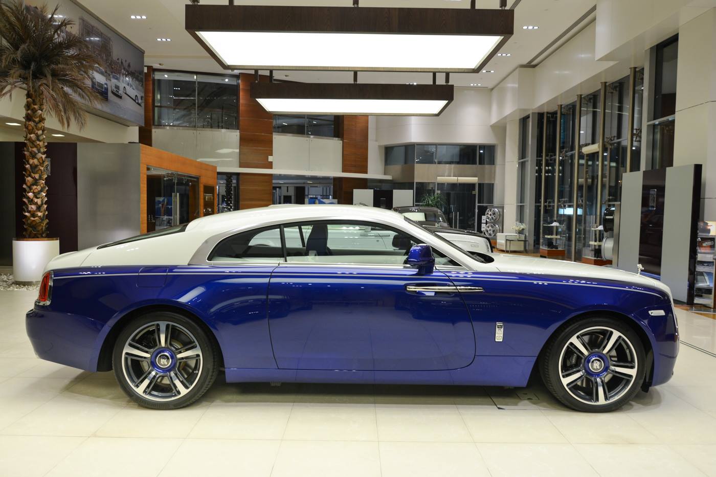 This Wraith, pictured here at Rolls-Royce Motor Cars in Abu Dhabi, is wearing a Salamanca Blue with English White body, while the interior has been adorned in Cobalto Blue with a Seashell contrast.