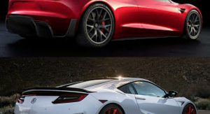 Looking from above, the curiosities continue. Both the Roadster and NSX feature hoods with tapered lines stretching down towards the front bumper. The shape of the rear quarter panels is also quite similar, although the Tesla is slightly more curvaceous and uses fewer straight lines than the NSX.