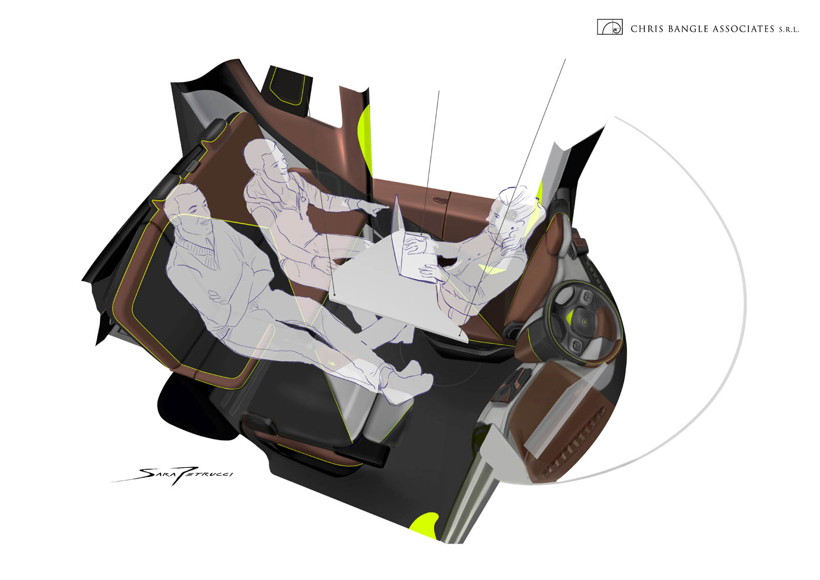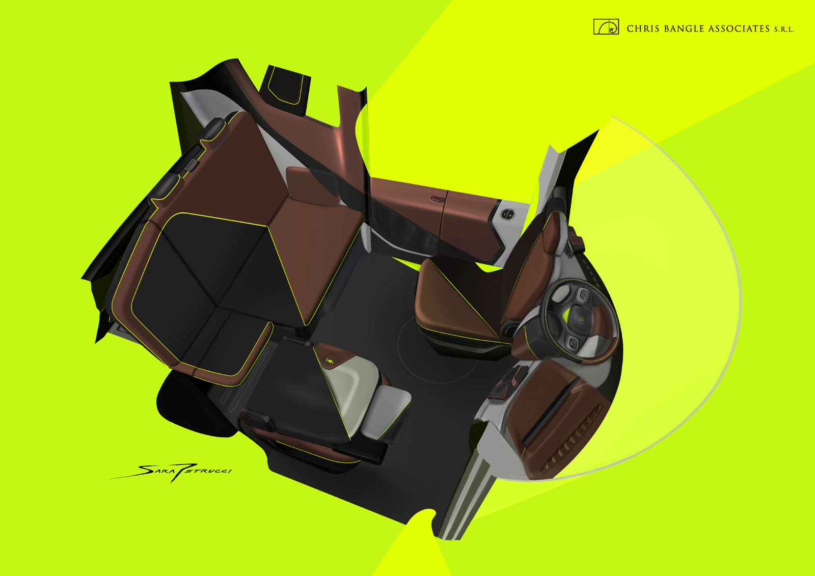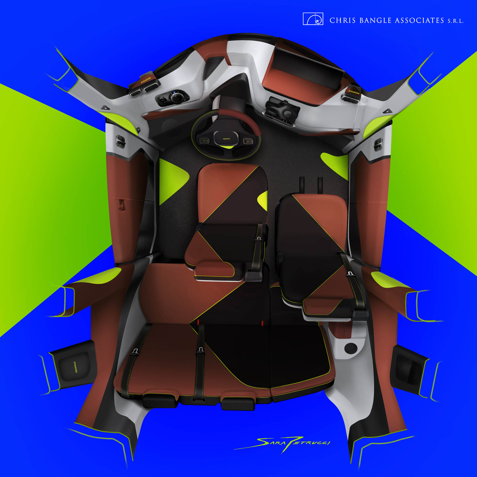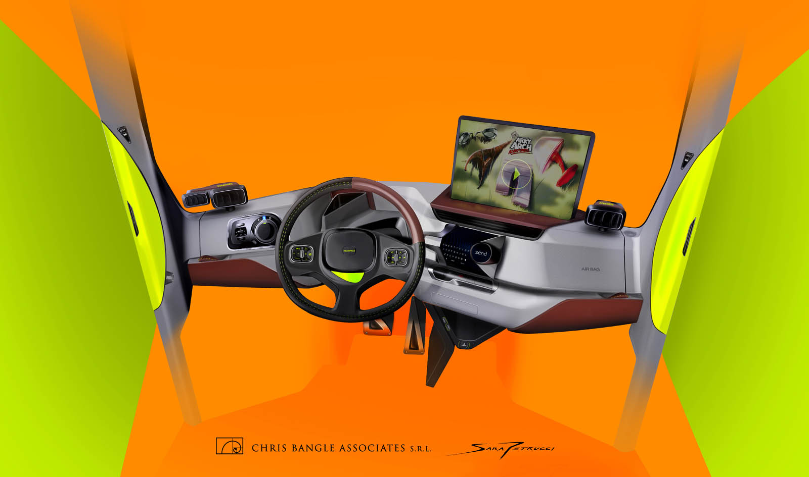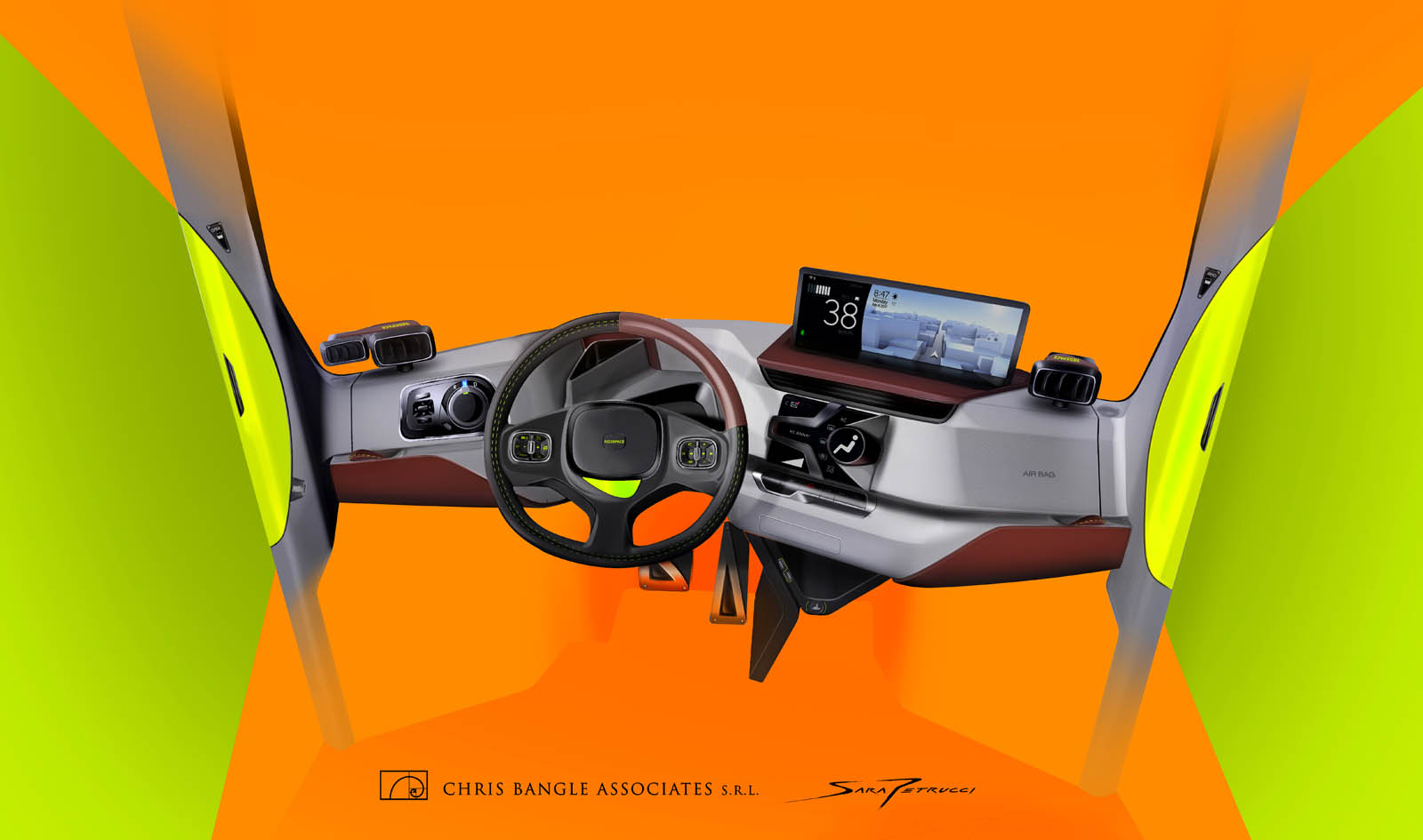 Bangle takes pride in the form that looks like something a kid would draw, its tall form cutting an unconventional profile. Inside the tall greenhouse is room for four (or five when parked) in two bucket seats and a wraparound rear love-seat.