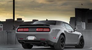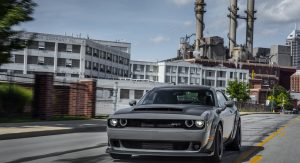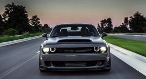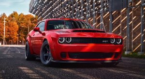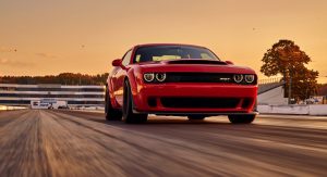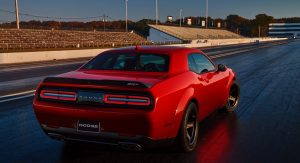Unveiled at the New York Auto Show, the Dodge Challenger SRT Demon is billed as the “industry’s first and only purpose-built, street-legal production drag car.” It features a supercharged 6.2-liter V8 engine that produces up to 840 hp (626 kW) and 770 lb-ft (1042 Nm) of torque. The engine is connected to an eight-speed automatic transmission which enables the model to accelerate from 0-60 mph in 2.3 seconds and run the quarter-mile in 9.65 seconds at 140 mph (225 km/h).