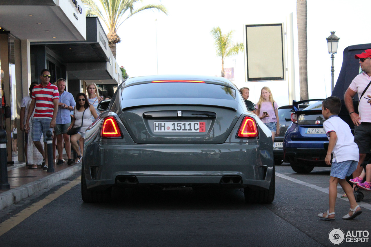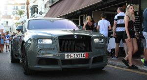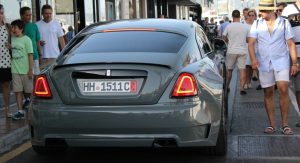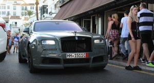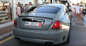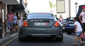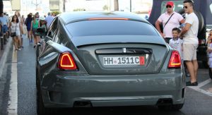 This particular Wraith, seen in Marbella, Spain by Autogespot user Damian12, is wearing Novitec’s SPOFEC Overdose kit, which includes carbon fiber fender extensions that increase the car’s width by 5 inches (12.7 cm) making it nearly 7 feet (2.1 m) wide, and a new set of 22″ alloys, while the air suspension can be lowered by as much as 1.6 inches (4 cm).