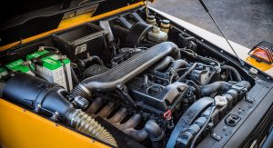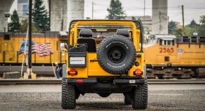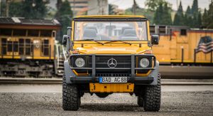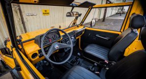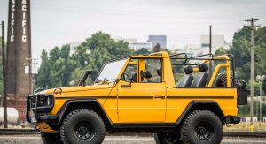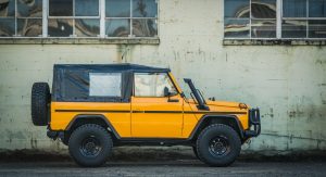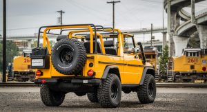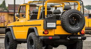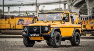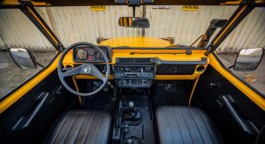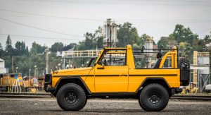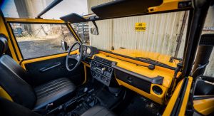 It is a 1990 military-spec G-Wagen which was restored with a bare-metal repaint in yellow that took place in Germany, a full rebuild of the five-speed manual, a new Sachs heavy-duty clutch, new MB-Tex captain seats, a 2-inch suspension lift and a set of 15-inch steel wheels fitted with giant 33-inch Mud Terrain tires.