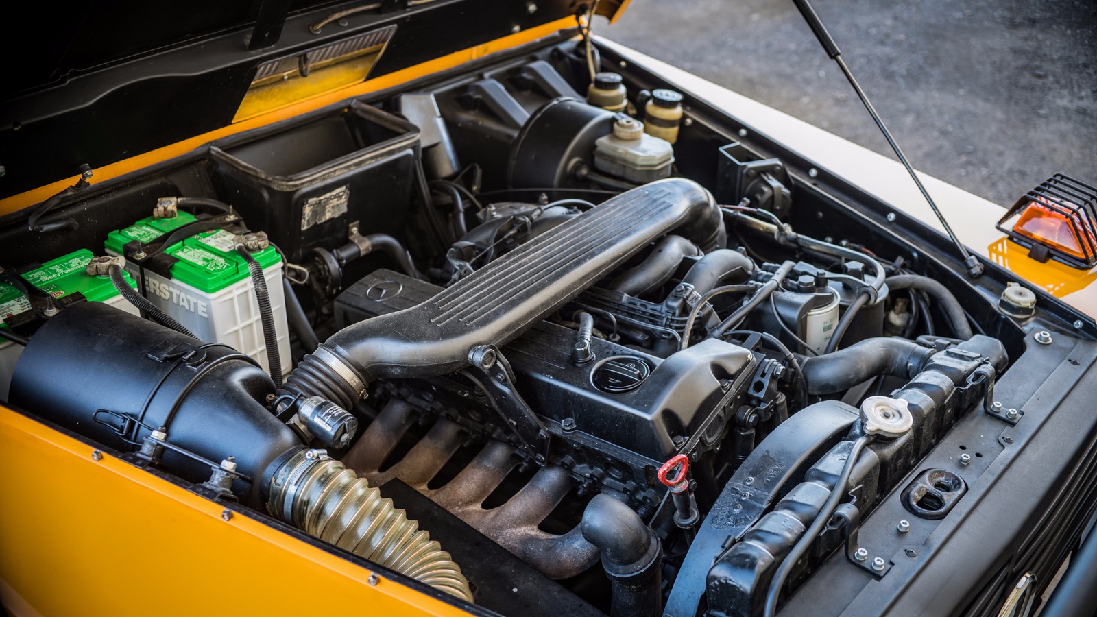The interior metal surfaces were matched to the exterior color, which we have to admit looks ace in the Geländewagen, and the same stands for the bigger wheels/tires. Power is provided by a non-original 2.5-liter OM602 five-cylinder diesel engine, with the car featuring locking differentials front and rear.