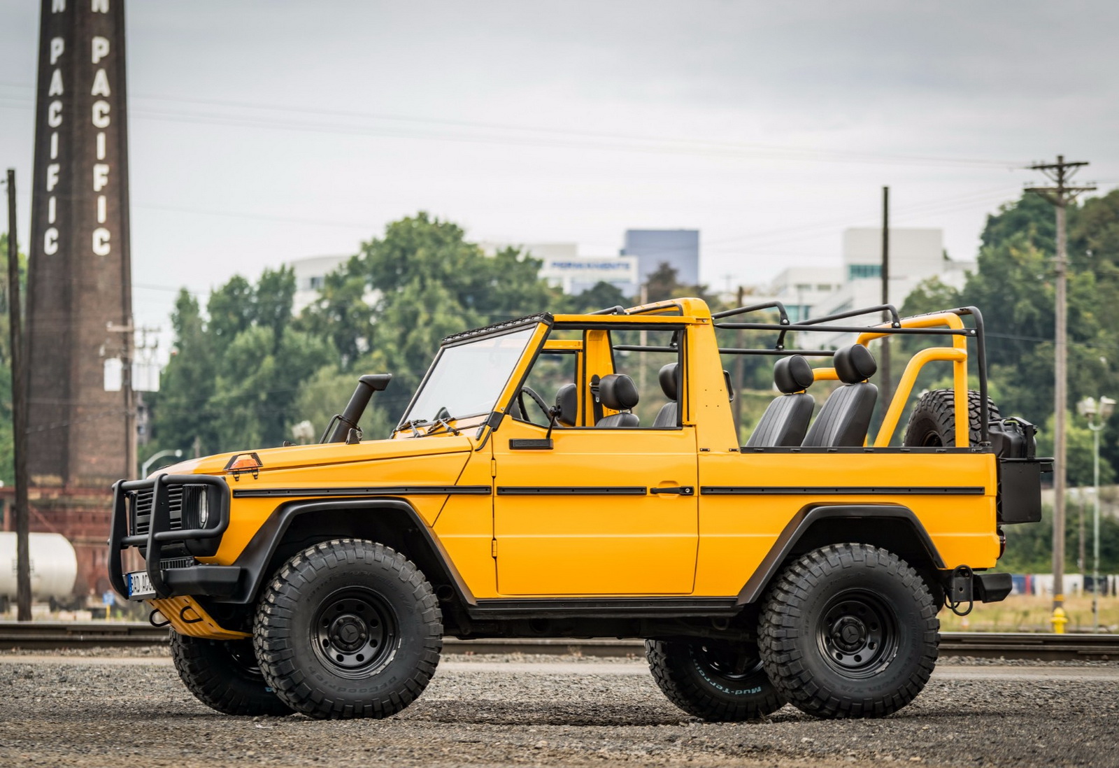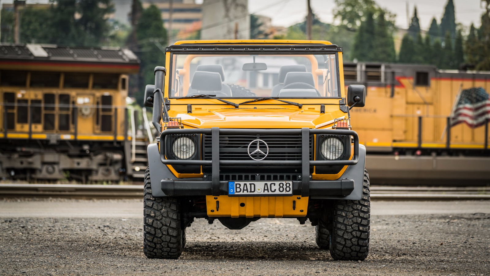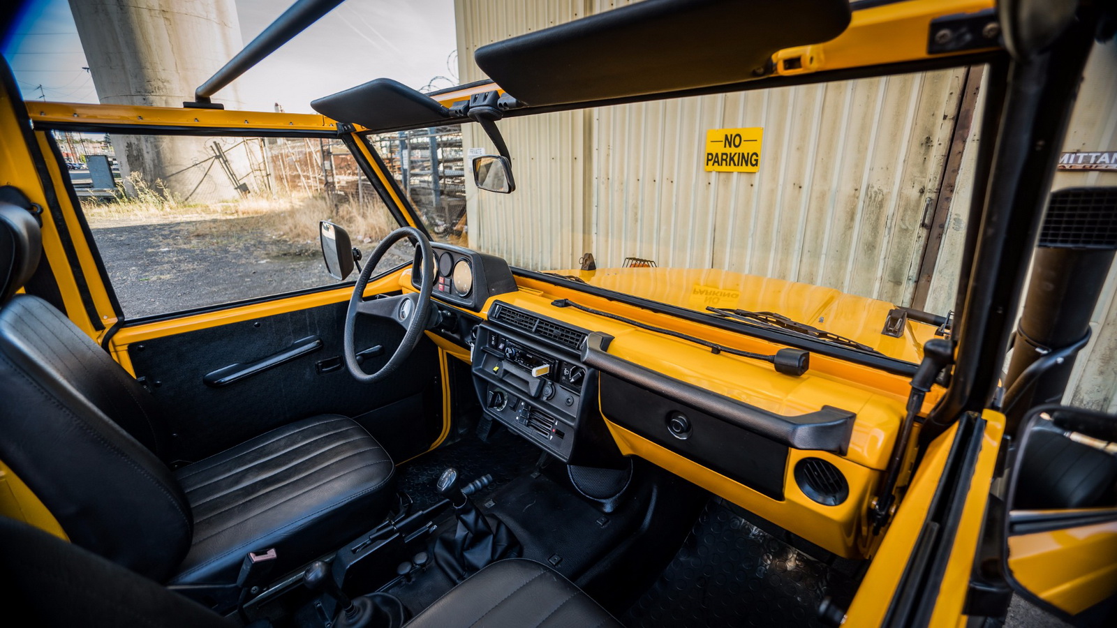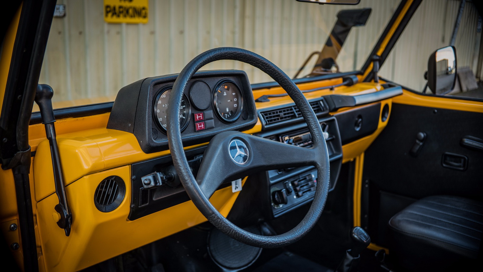 It is a 1990 military-spec G-Wagen which was restored with a bare-metal repaint in yellow that took place in Germany, a full rebuild of the five-speed manual, a new Sachs heavy-duty clutch, new MB-Tex captain seats, a 2-inch suspension lift and a set of 15-inch steel wheels fitted with giant 33-inch Mud Terrain tires.