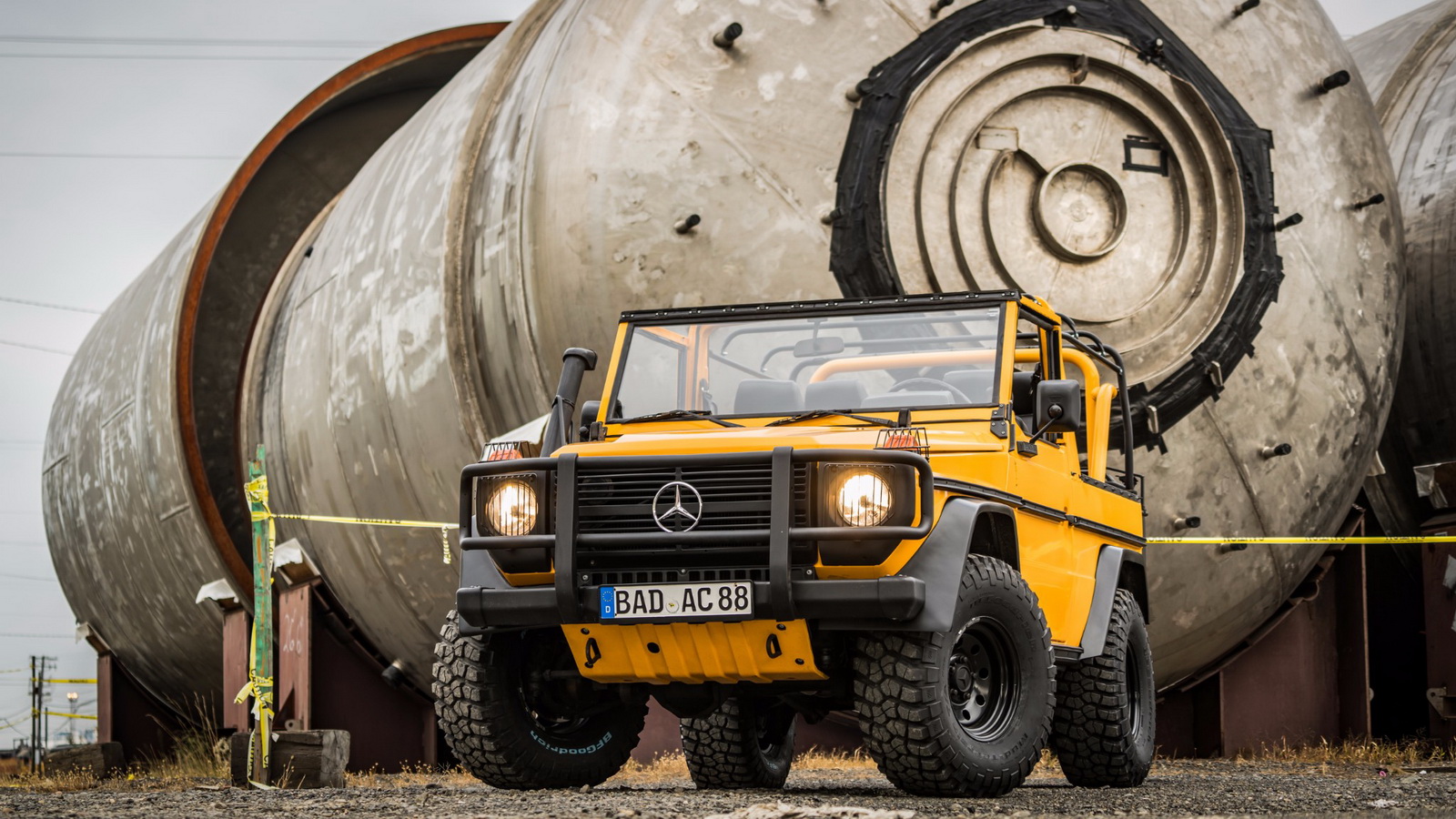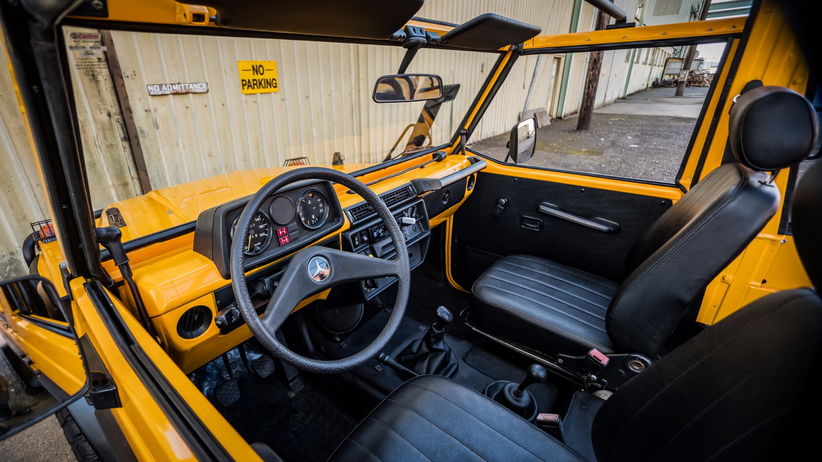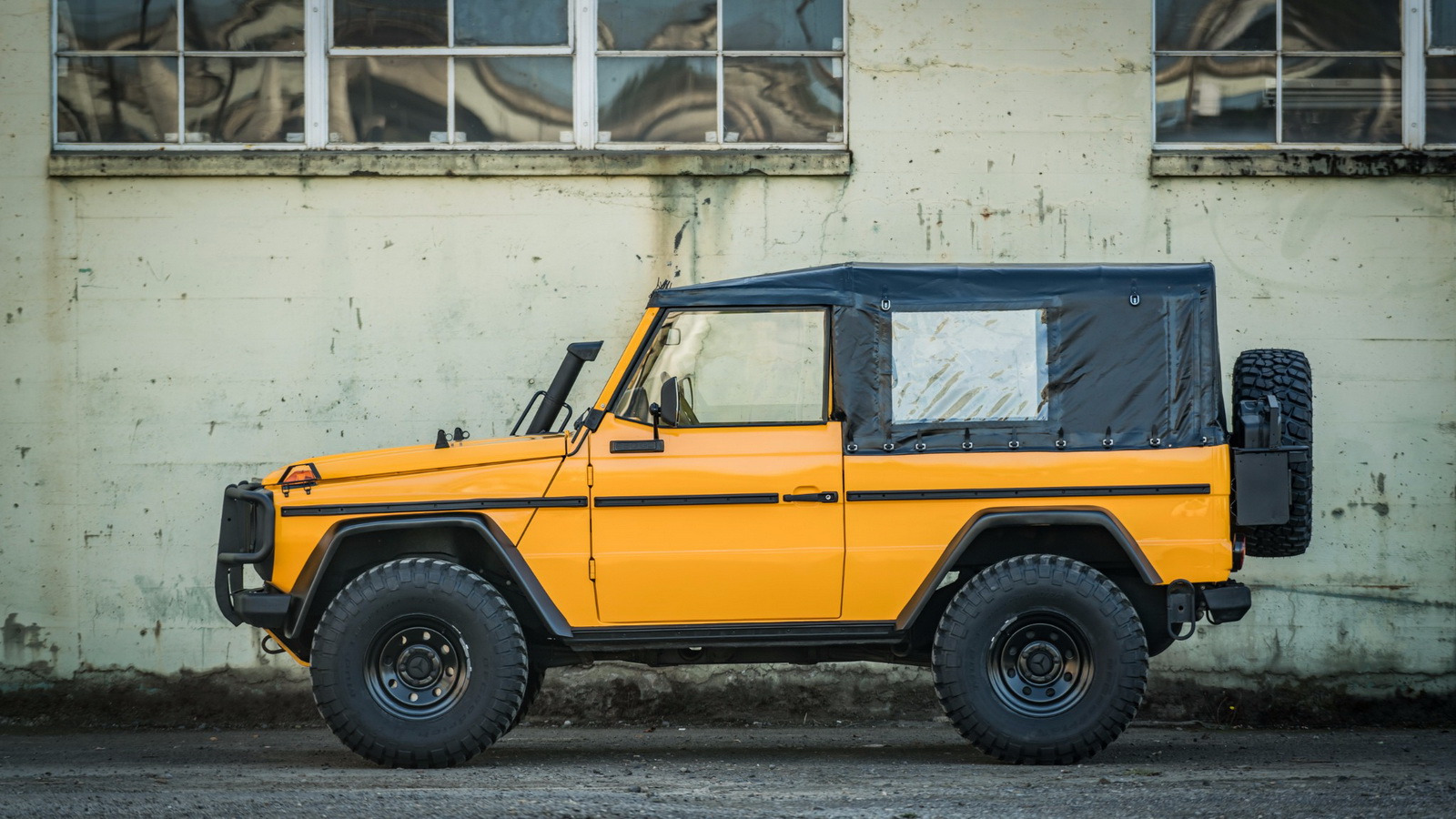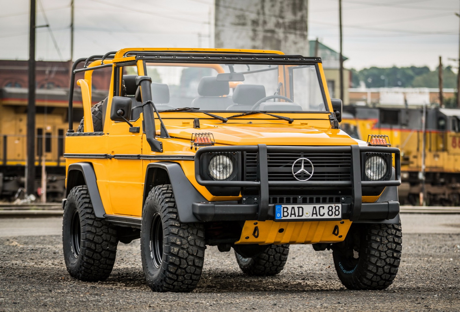 It is a 1990 military-spec G-Wagen which was restored with a bare-metal repaint in yellow that took place in Germany, a full rebuild of the five-speed manual, a new Sachs heavy-duty clutch, new MB-Tex captain seats, a 2-inch suspension lift and a set of 15-inch steel wheels fitted with giant 33-inch Mud Terrain tires.