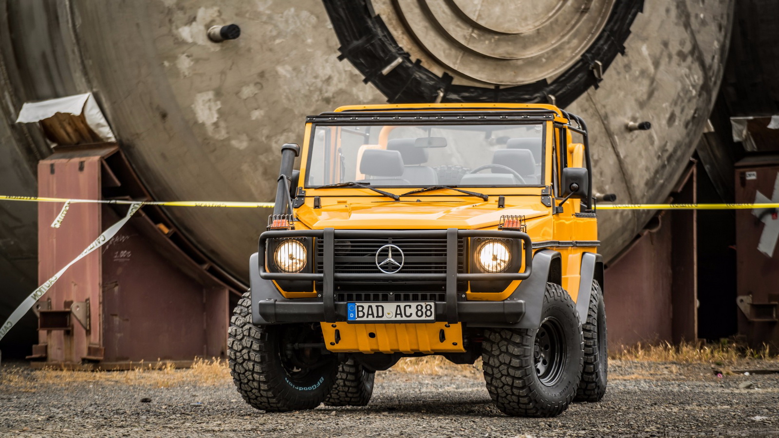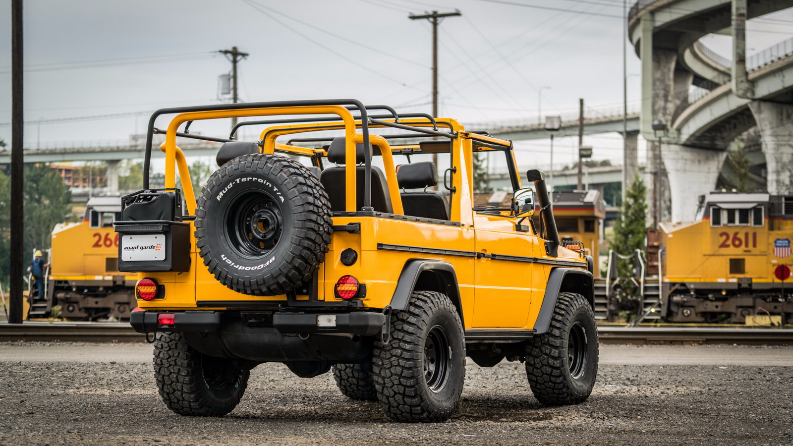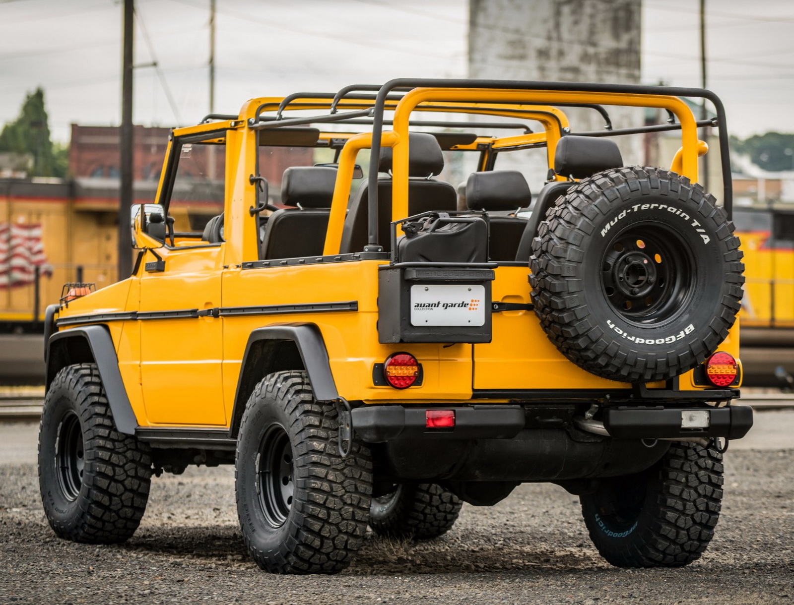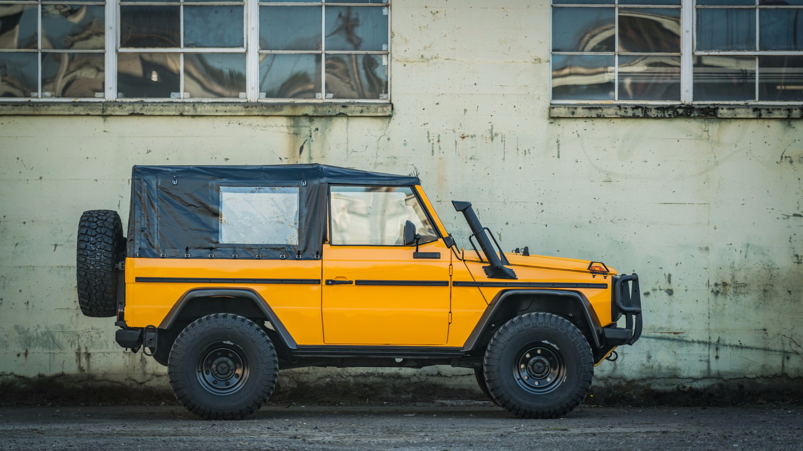 It is a 1990 military-spec G-Wagen which was restored with a bare-metal repaint in yellow that took place in Germany, a full rebuild of the five-speed manual, a new Sachs heavy-duty clutch, new MB-Tex captain seats, a 2-inch suspension lift and a set of 15-inch steel wheels fitted with giant 33-inch Mud Terrain tires.