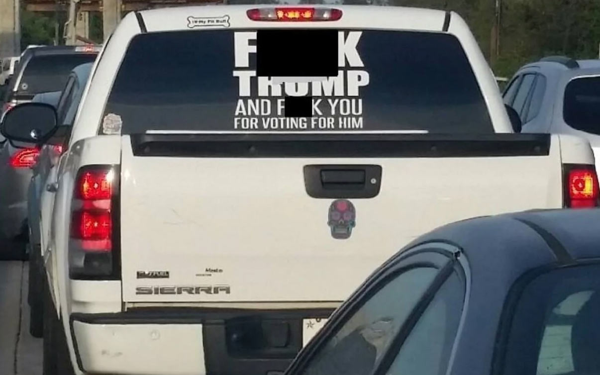A couple in Texas decided to vent their frustrations by putting a large decal on the back of their GMC Sierra which stated “F*ck Trump and f*ck you for voting for him.”