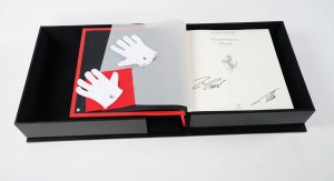 The top edition featured a red leather binding with a diamond-encrusted Prancing Horse emblem on the over, placed in a carbon-fiber clamshell case, and hand-signed by the Scuderia’s drivers and the company’s chairman at the time: Fernando Alonso, Felipe Massa, and Luca di Montezemolo. It even came with a set of white gloves with which to handle the pages.