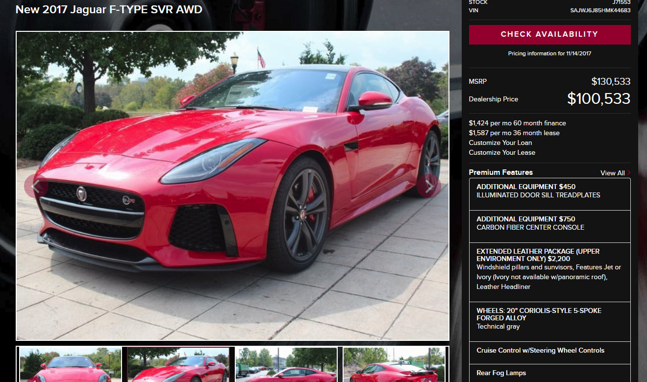 Importantly, it is the dealer’s prerogative as to whether or not it passes on these incentives to customers. One dealership already advertising a heavily discounted F-Type SVR AWD is Jaguar Louisville, pricing the performance car at just $100,533, a full $30,000 off the MSRP.