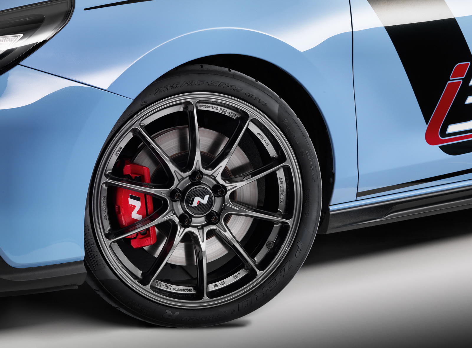 A set of lightweight 10-spoke alloy wheels from OZ Racing measuring 8.0×19 inches brings a weight saving of about 4kg per corner compared to the standard wheel. The wheels also feature a carbon-fiber hub cover with the Hyundai N logo and are priced at 1,916 euros in Germany.