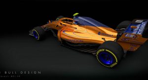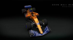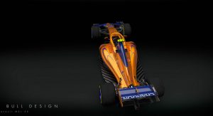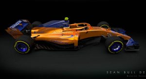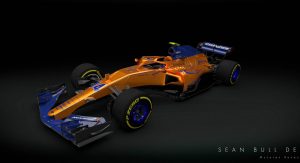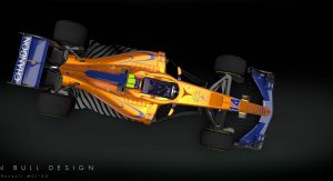 Imagined by livery specialist Sean Bull is a projected look at the 2018 McLaren-Renault MCL33, rendered in orange and blue – and with an integrated “halo” cockpit safety device, too.