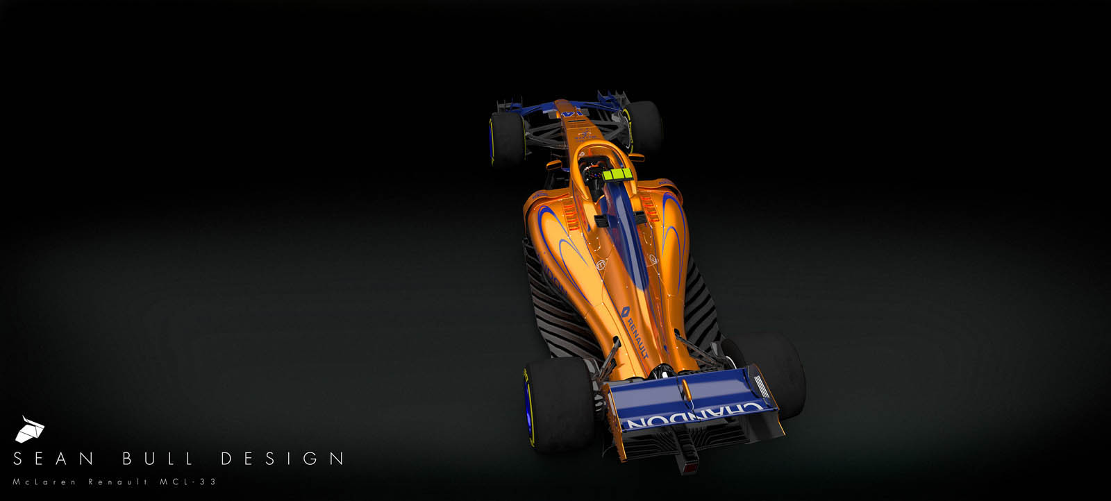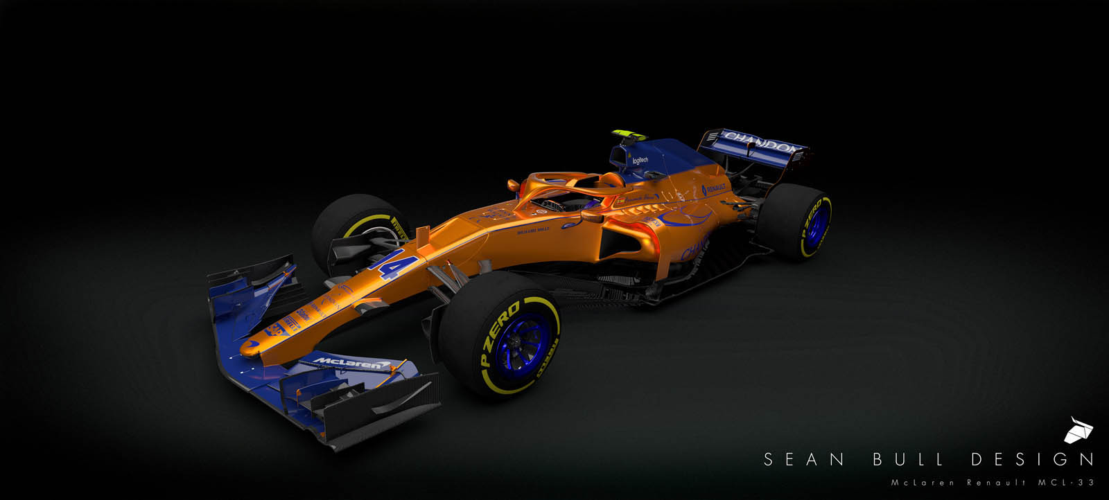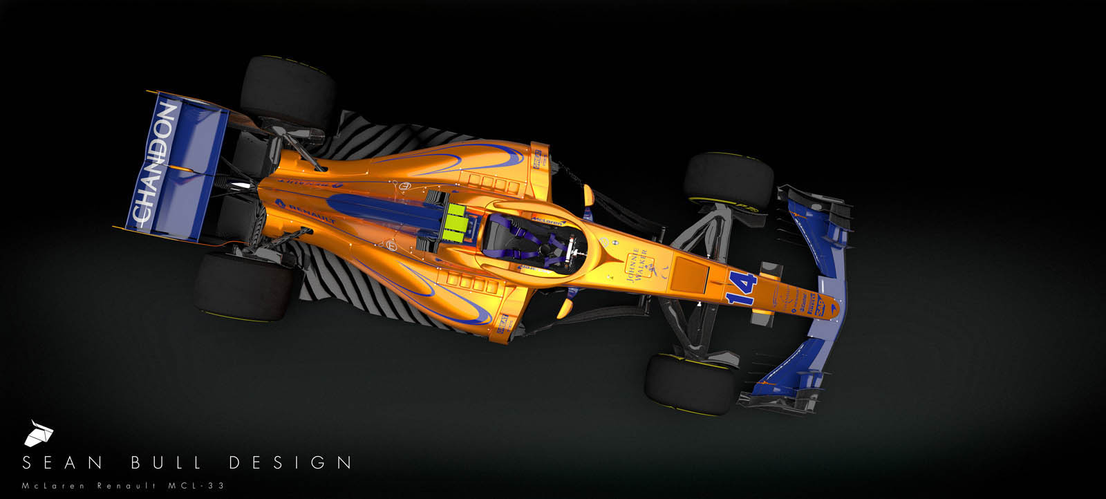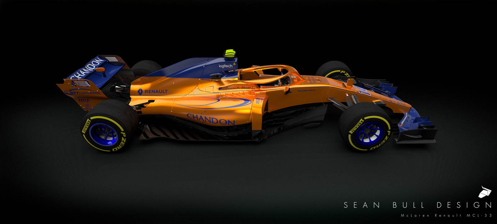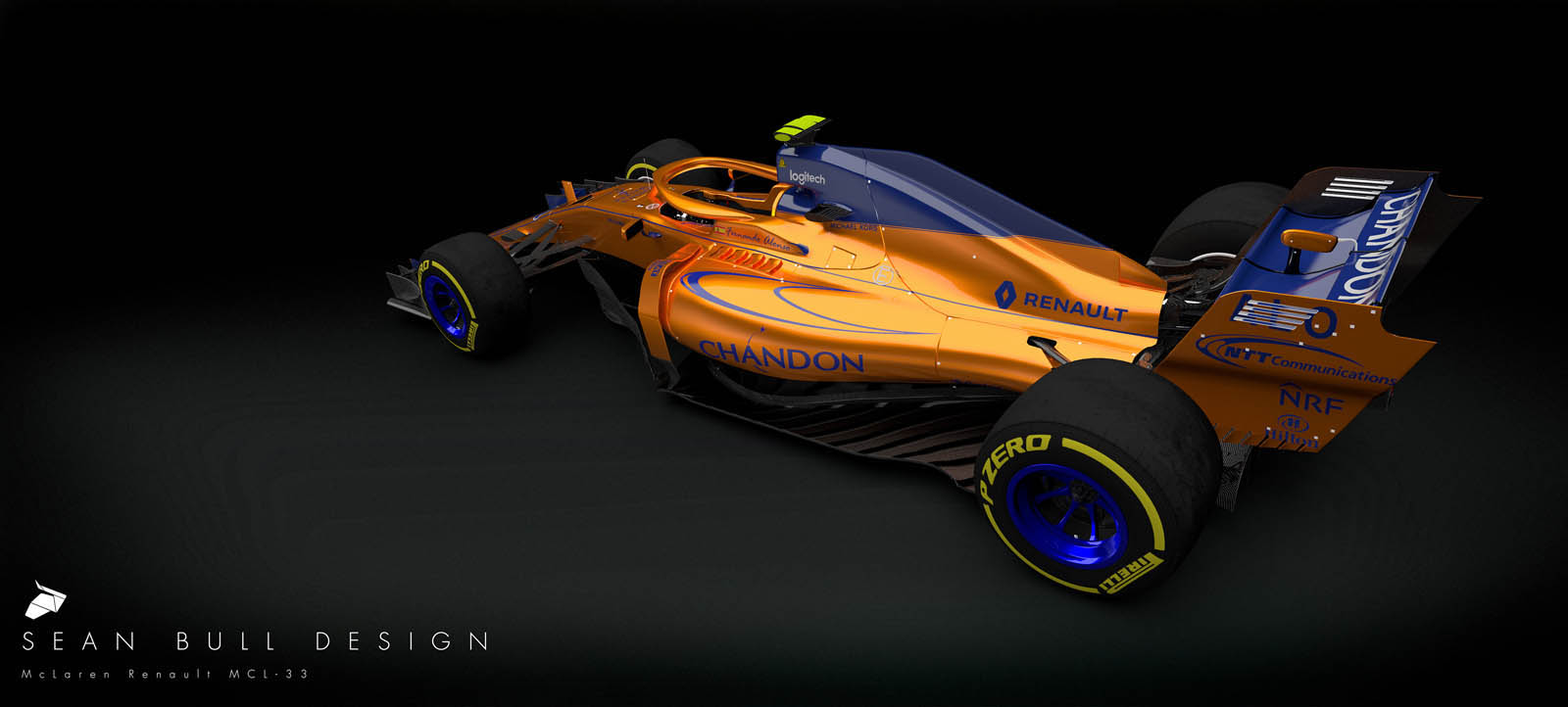 Imagined by livery specialist Sean Bull is a projected look at the 2018 McLaren-Renault MCL33, rendered in orange and blue – and with an integrated “halo” cockpit safety device, too.