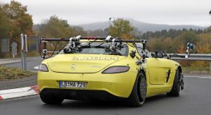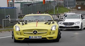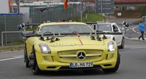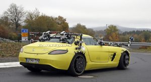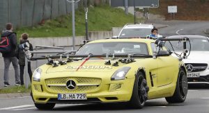 Decked out in an almost comical amount of equipment, the mysterious model has us scratching our heads as we’re not entirely sure what’s going on. One possibility is that Mercedes is working on an electric version of the AMG GT and the company decided to use an old SLS AMG Electric Drive as a mule.