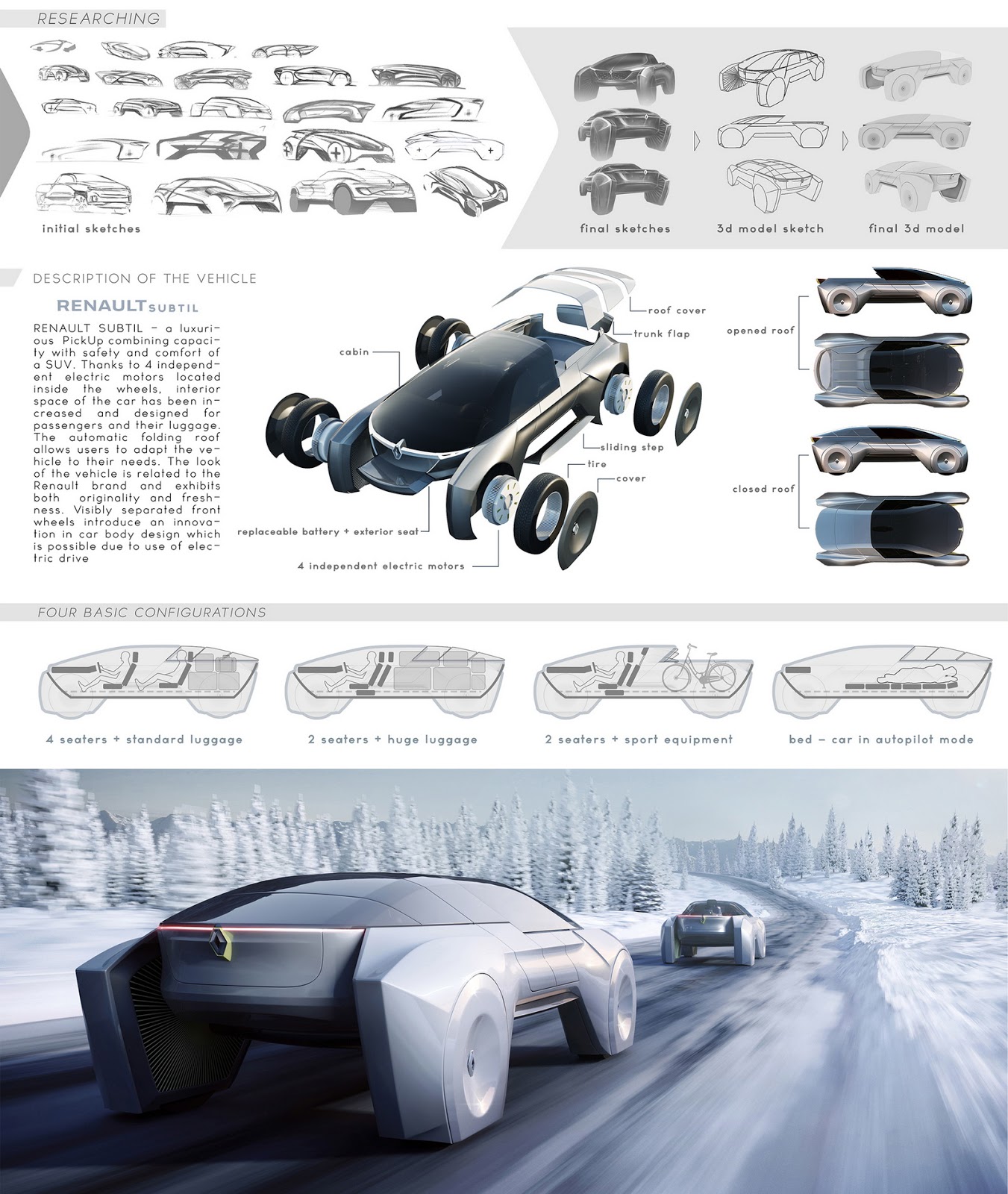 If you look at the blueprints, you’ll see that the Subtil automatically converts from an SUV to a pickup, with various configurations available. It was designed to be transformed from a 4 seater with a standard luggage compartment, to a two-seater with a large luggage compartment and a two-seater with space for sports equipment (like a bike or a snowmobile). You can also put the car in autopilot mode and convert the interior into a bedroom.
