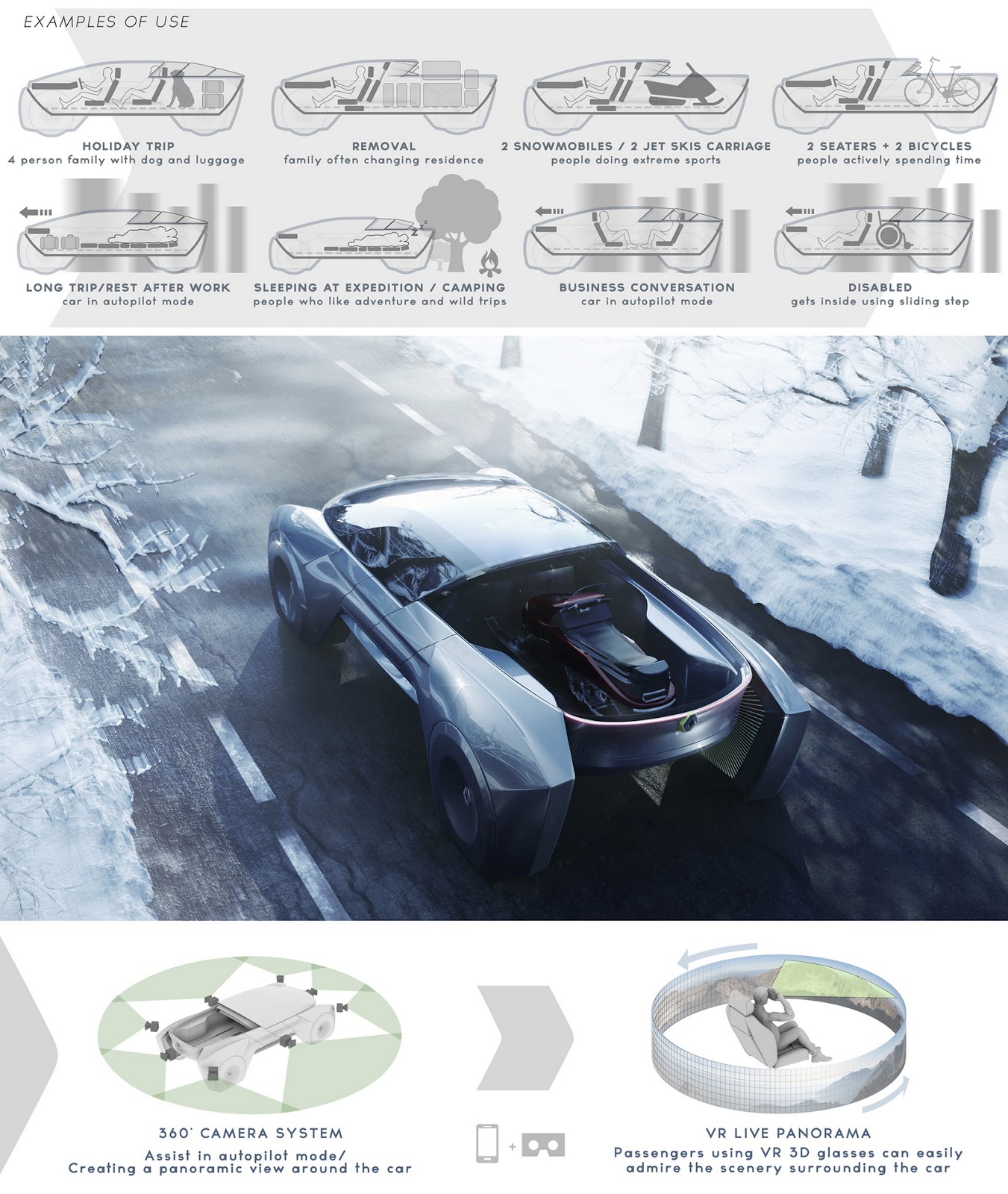 The designer says you can setup the cabin in any way you want, while thanks to the car’s 360 camera system, you can use VR 3D glasses to check out the surrounding scenery.