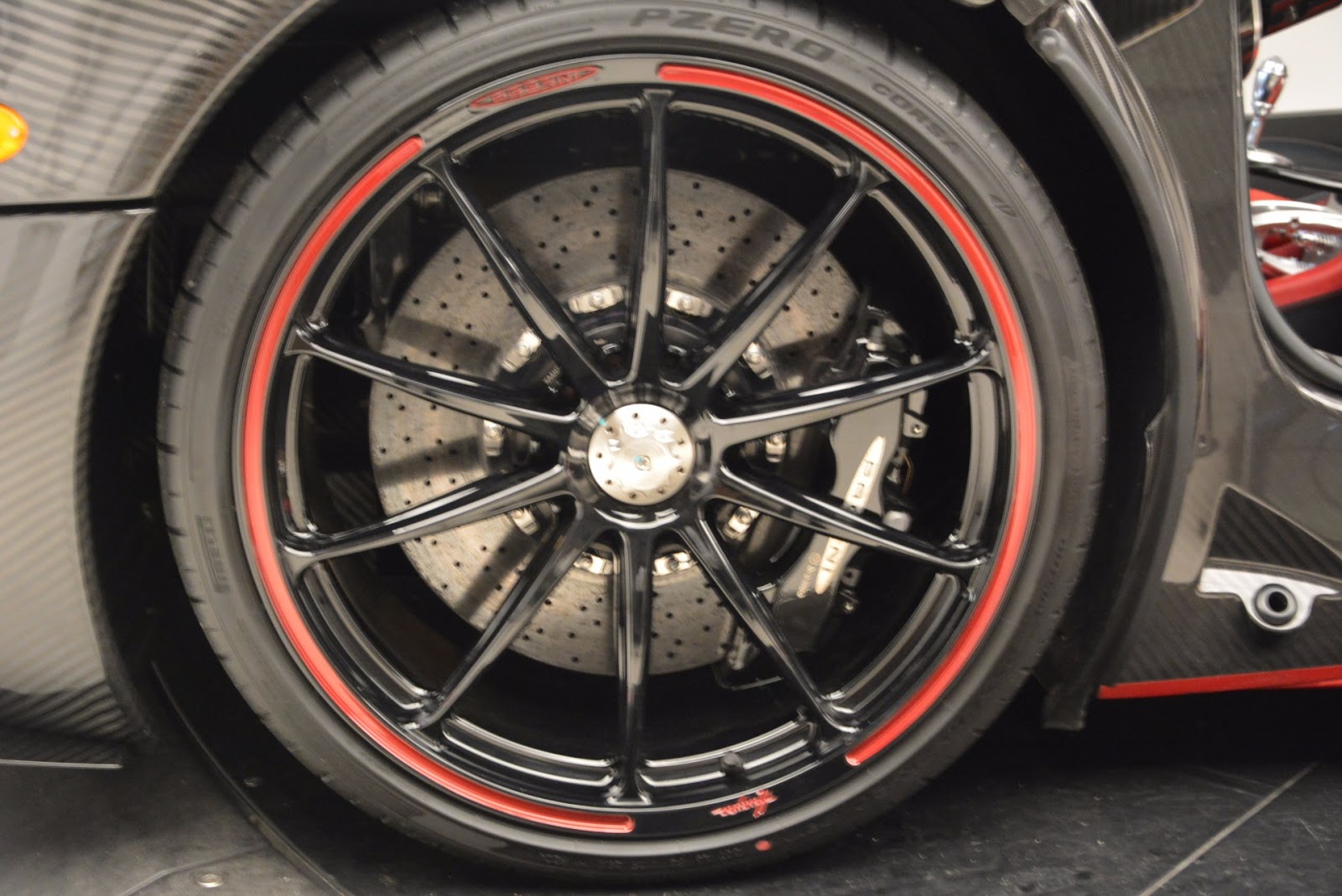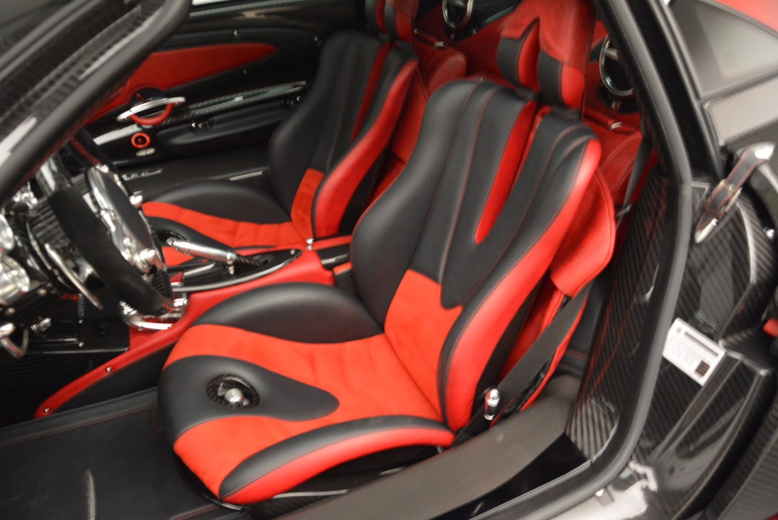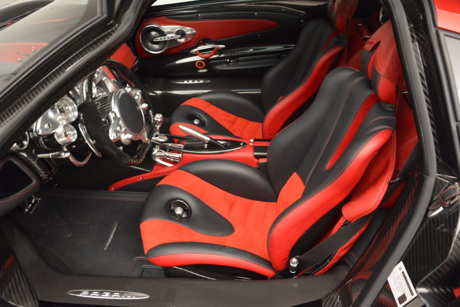 This particular Huayra is number 57 and believed to be one of the first units that reached U.S. soil. It can be easily distinguished from all other cars to leave Pagani’s factory thanks to the combination of red accents and a gloss carbon fiber body.