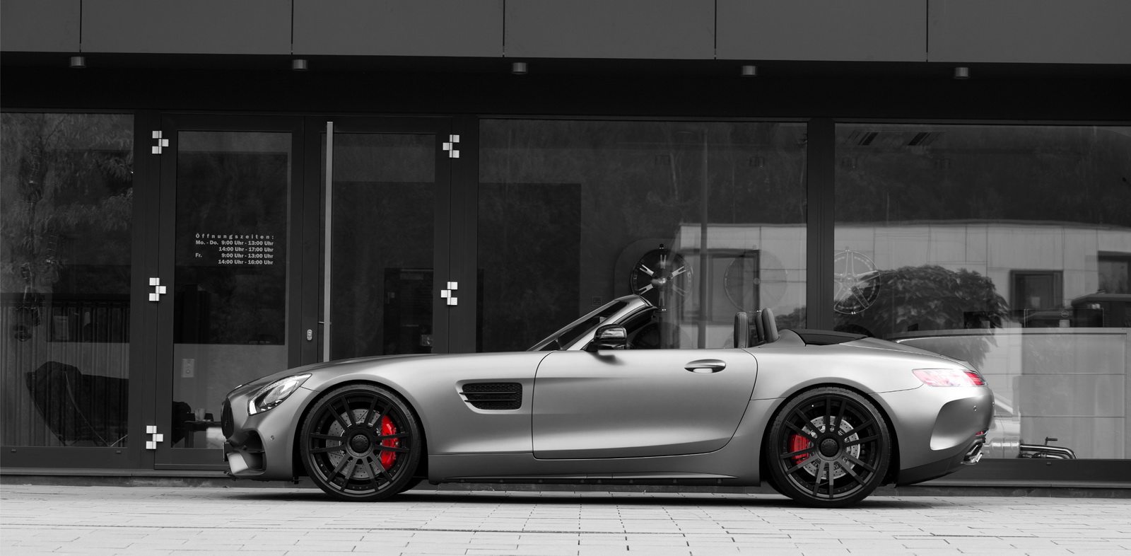Making this Mercedes-AMG GT C Roadster appear even more dramatic are the satin black finish, and height-adjustable springs, which can be replaced with a coilover suspension made by KW for enhanced track performance.