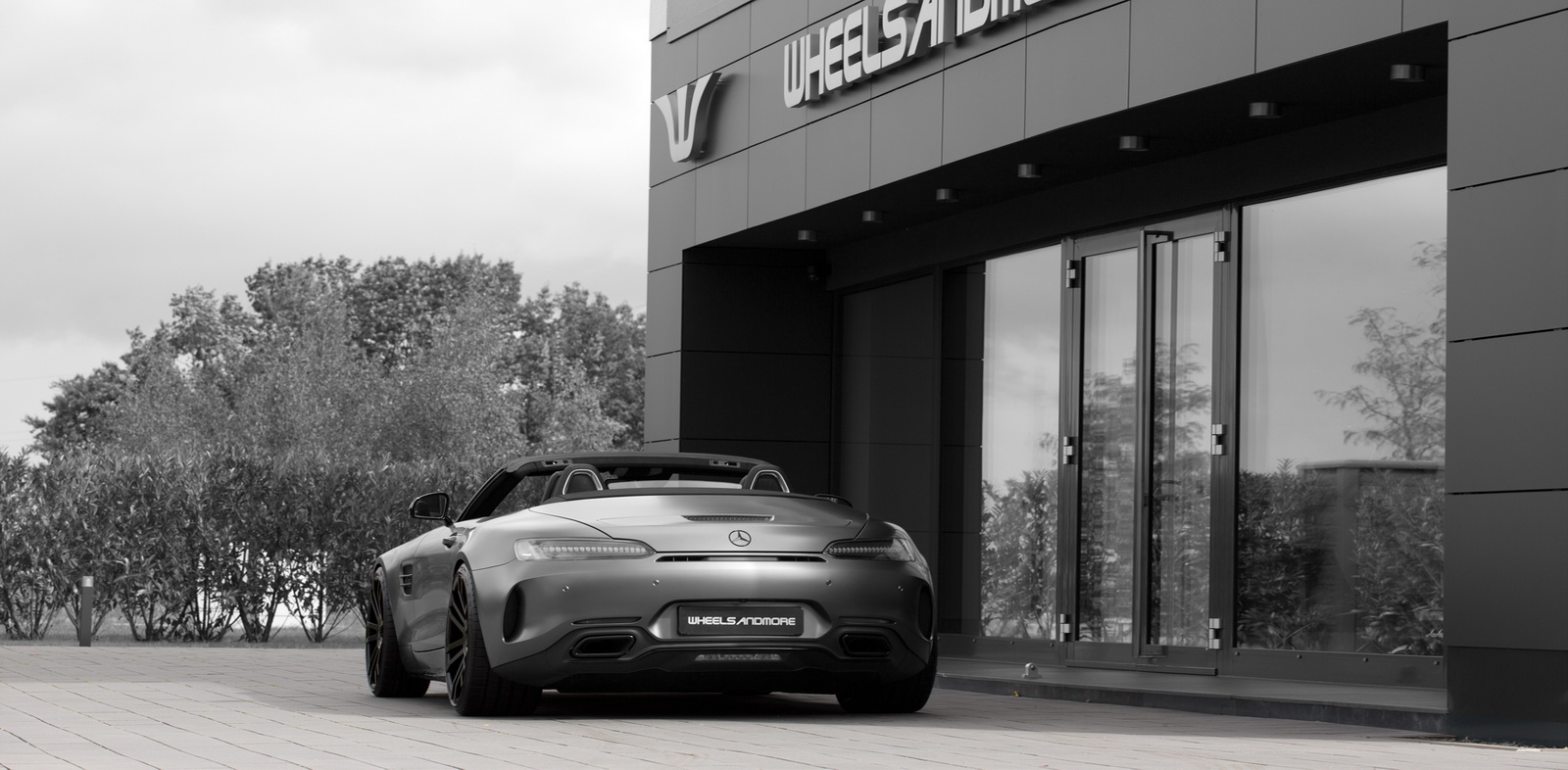 It may be shot in white and black, reminiscent of times long gone, but there’s nothing classic about this Mercedes-AMG GT C Roadster.