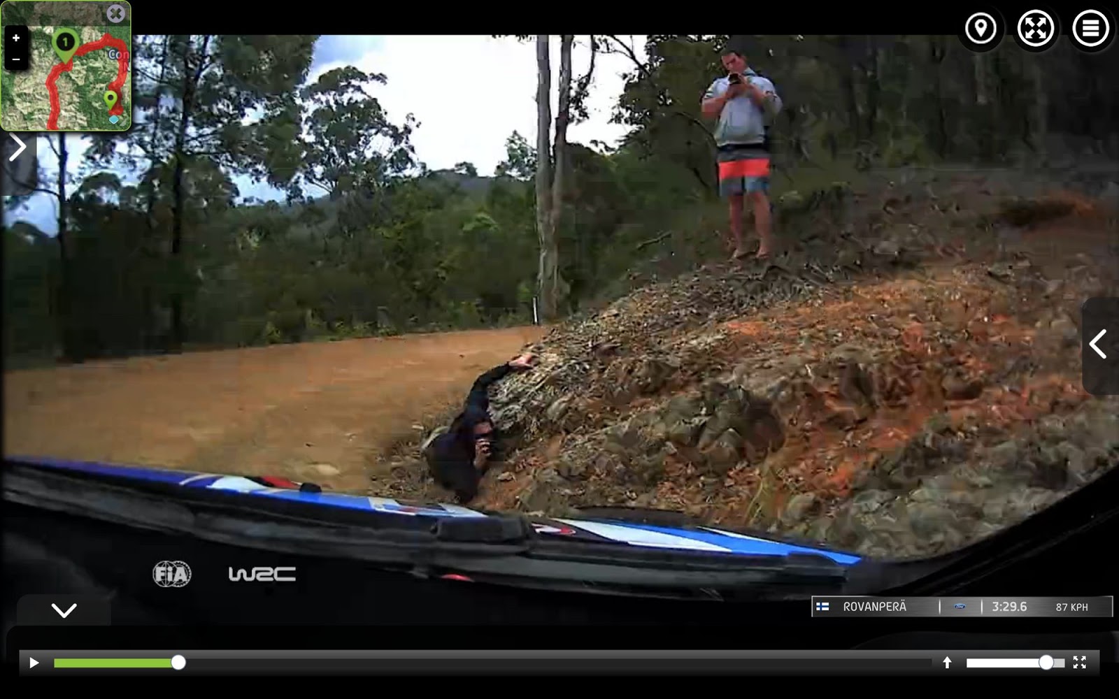 These screenshots taken from the broadcast of the Welsh Creek stage, show at least four men putting themselves in harm’s way to try and get the best picture possible.