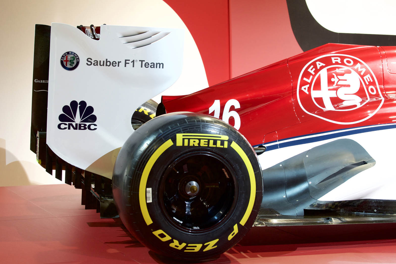 The color scheme, as you can see, is primarily white at the nose and sidepods, and red at the upper air intake and engine cover. The prominence of the Alfa Romeo emblems marks not only the first time that the Italian marque will be represented (beyond some small logos on Ferrari’s cars) for the first time in over 30 years, but the welcome arrival of a primary sponsor for the Swiss team that’s been struggling since parting with BMW.