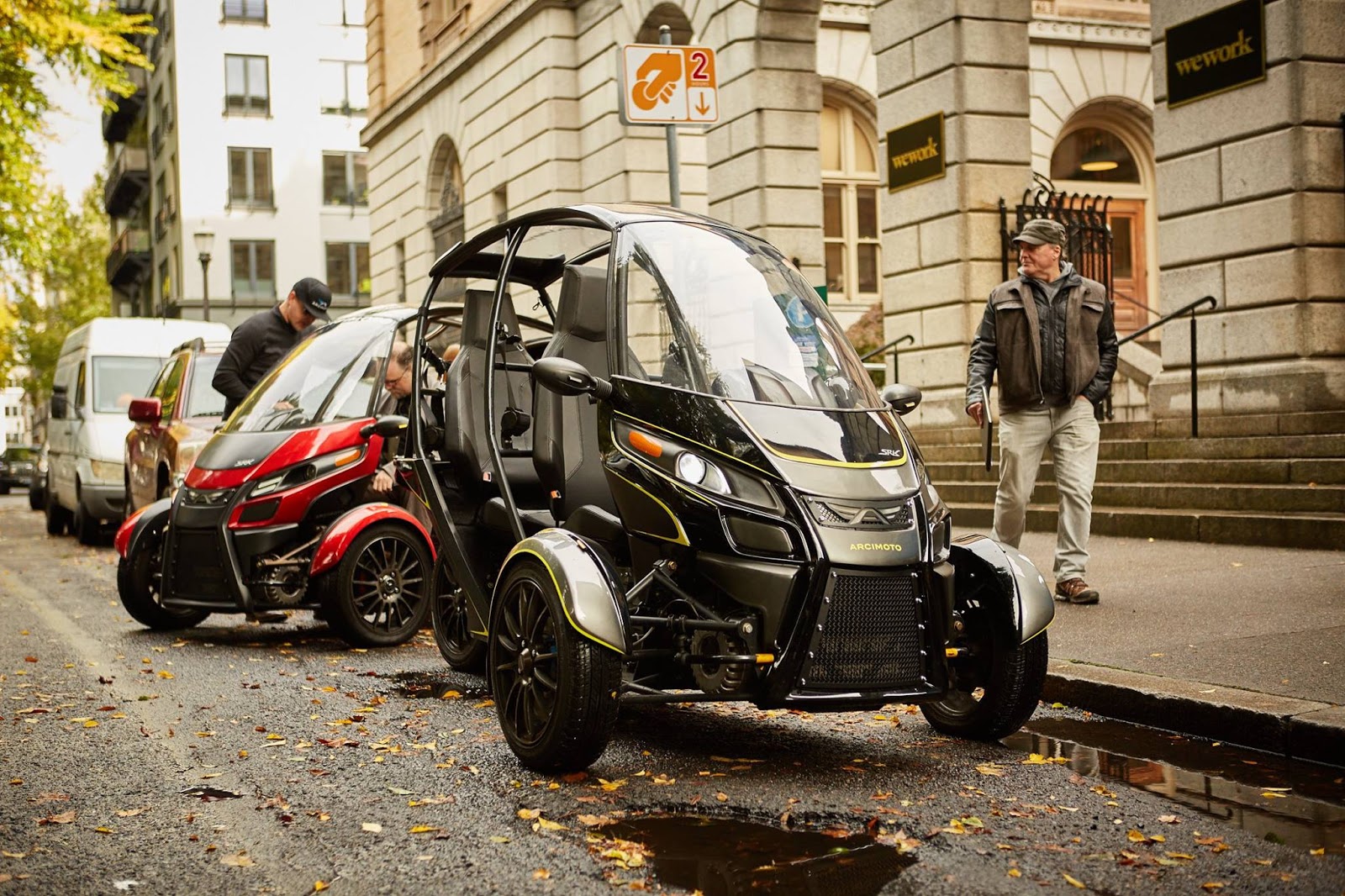 As you can see, the SRX is half motorcycle and half car. It consists of two seats, traditional motorcycle controls, two wheels at the front, and one wheel at the rear. The SRX is also fully-electric.