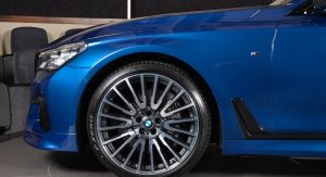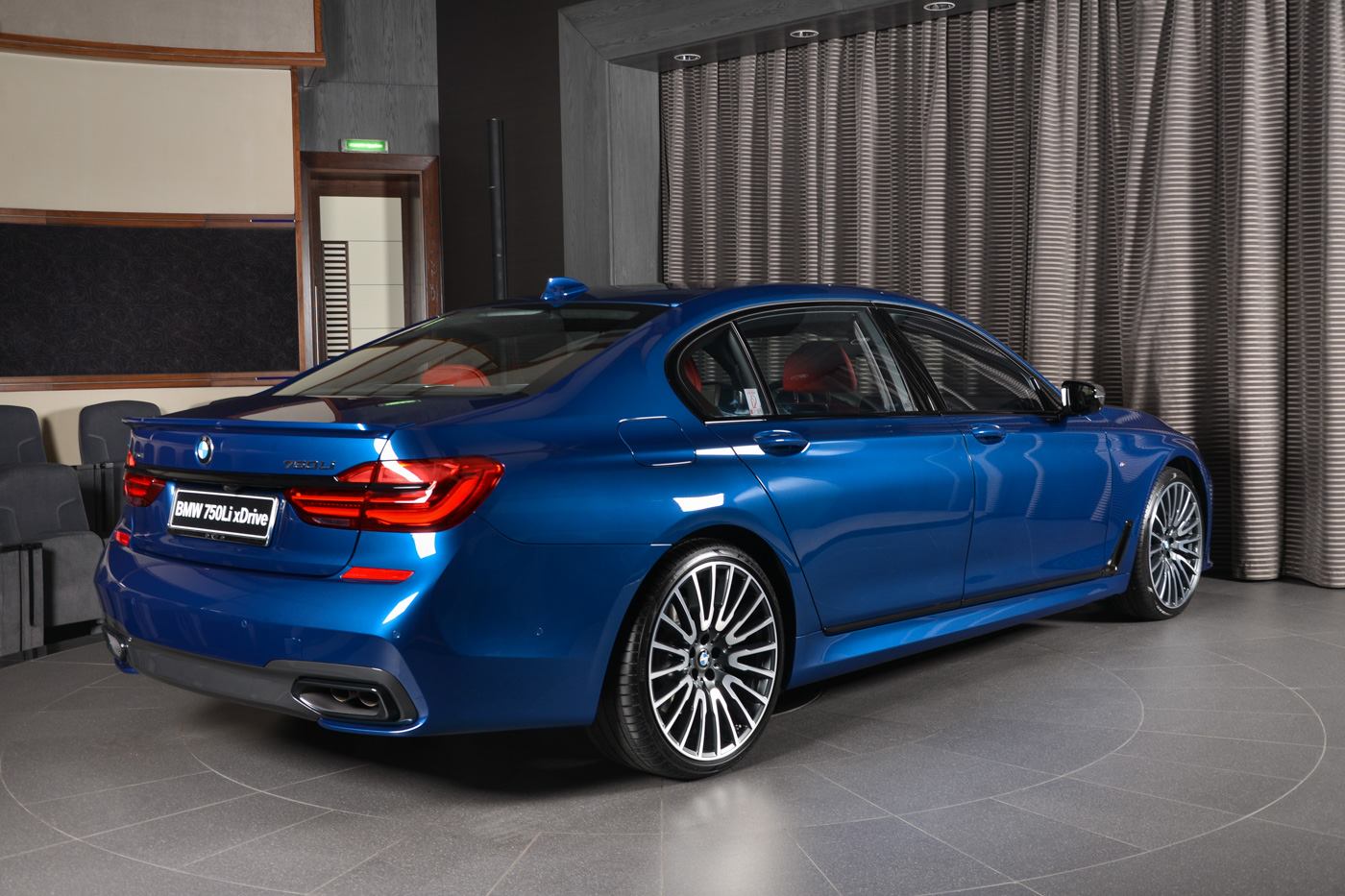 This 750Li has been fitted with a 3D Design custom front bumper, get black kidney grilles, carbon fiber mirror covers and an Alpina boot lid spoiler, and it sports an Avus Blue paintjob from BMW Individual’s catalog.
