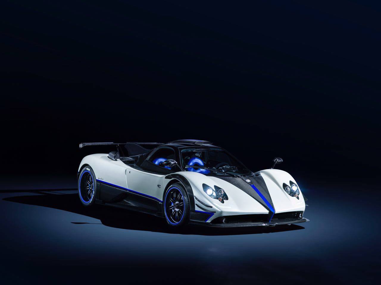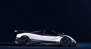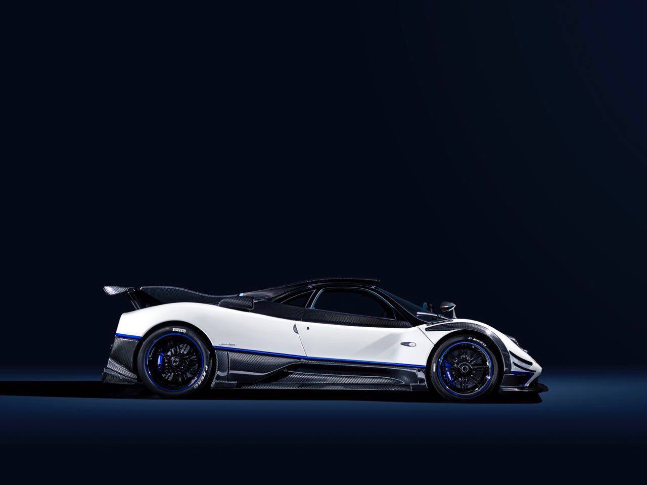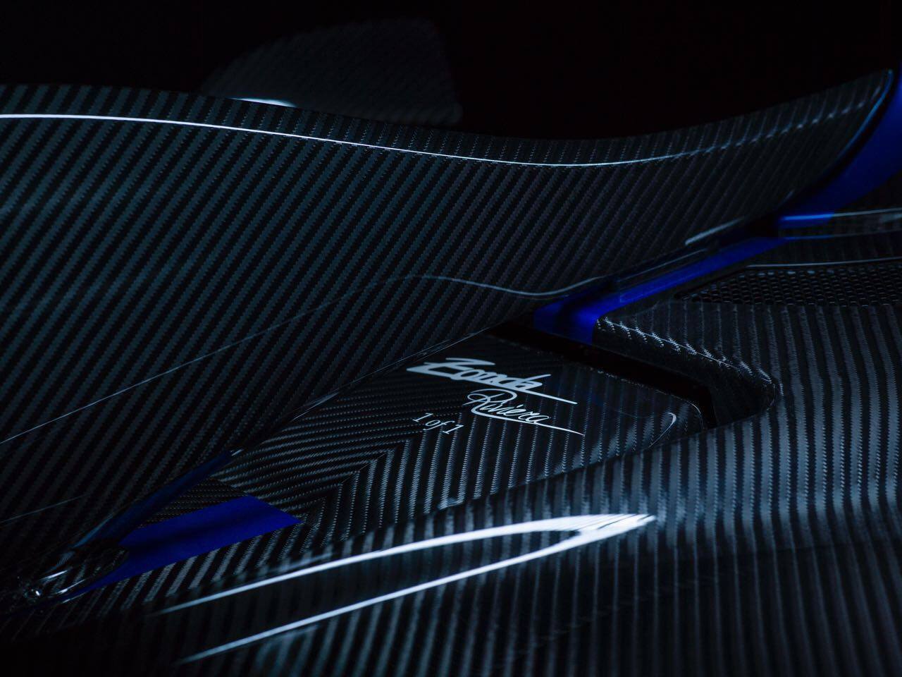 The exterior of the Riviera incorporates a stunning pearl white paint scheme that’s been contrasted by gloss carbon fiber elements. Such a combination of white paint and carbon is typical of a Zonda but what makes the Riviera stand out are the bright blue accents, namely the central stripe running the length of the car, accents on the black wheels, and blue pinstripes running above the carbon side skirts. Other eye-catching touches of the car include four carbon canards on the front fascia, a roof scoop, large rear wing, shark fin, and an aggressive diffuser. For the most part, the exterior is very similar to the Zonda Cinque.