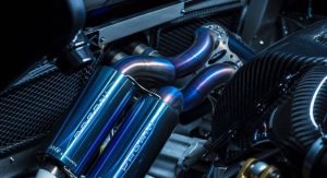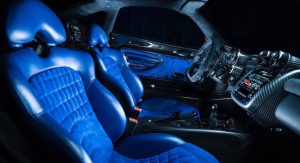 Inside, the cabin is also rather stunning. The two bucket seats have been bathed in blue leather and alcantara while the rest of the cabin is a mix of black alcantara, black aluminum and carbon fiber.