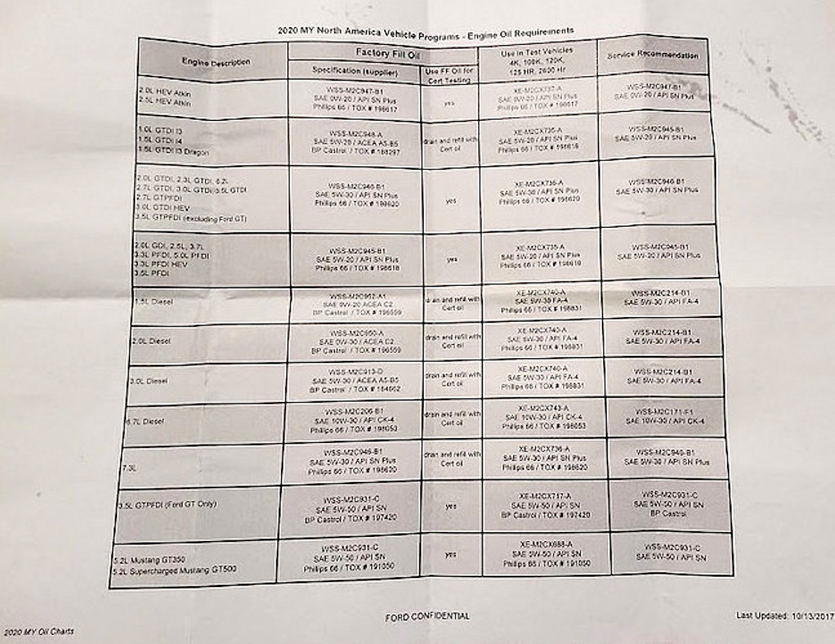 A member of the forum has shared a confidential Ford document titled ‘2020 MY North America Vehicle Program – Engine Oil Requirements’. For the most part, it’s a rather boring document that simply indicates the recommended oil to be used by service centers. What’s interesting is that it lists both the current Mustang GT350 and the long-awaited ‘Supercharged Mustang GT500’, all but confirming that the car is just around the corner.