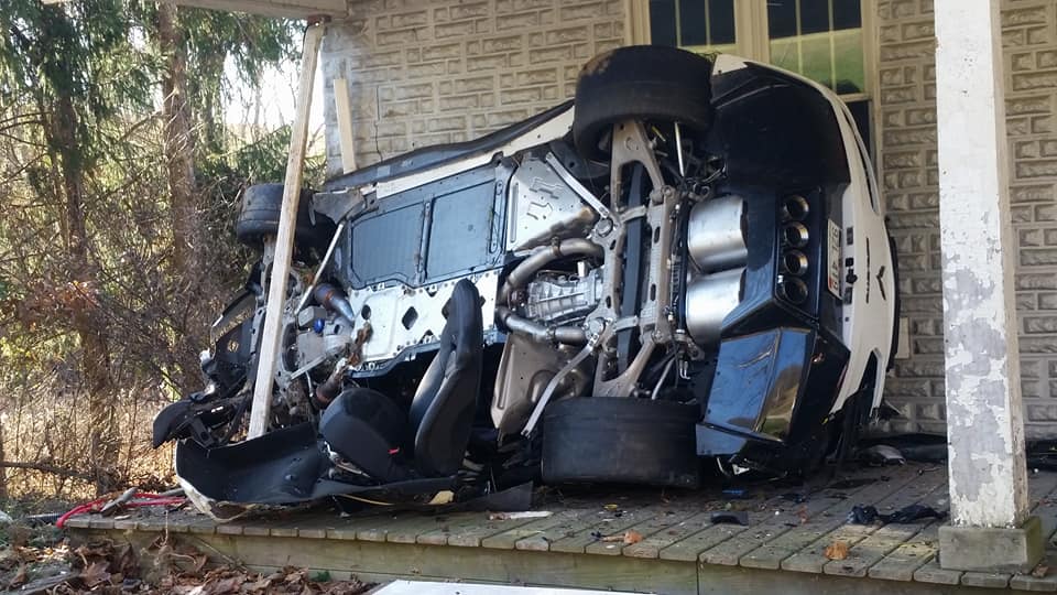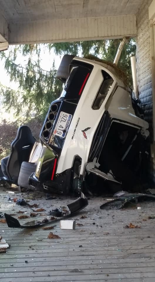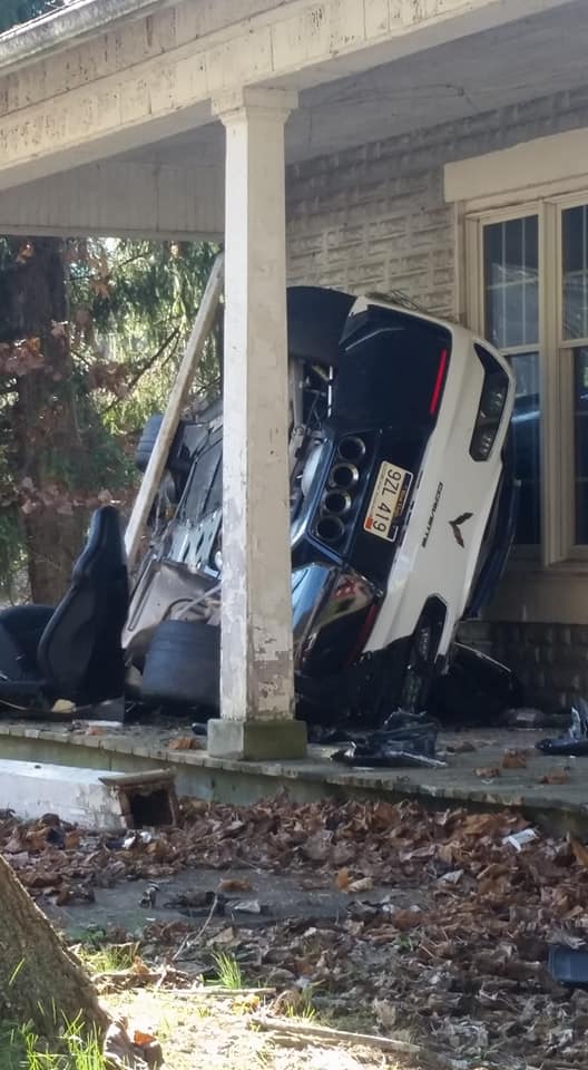 From the images posted on Facebook by Thomas Minnear, we can see that the Arctic White Corvette Z06, which appears to have been equipped with the Z07 Performance Package, rests sideways on the front porch of a house, in West Virginia.