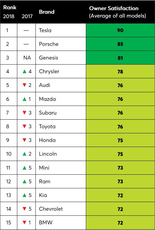 So how are things this year? Compared to 2016, the top two remains unchanged, with Tesla and Porsche as the clear cut winner and runner-up duo. However, where last year Audi, Subaru and Toyota rounded out the top 5, this year the order is Genesis, Chrysler (which climbed 4 spots) and Audi.