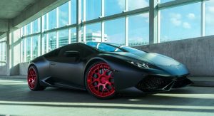 In this case, however, the Lambo is fitted with red wheels from Avant Garde, which are available from 19 to 22 inches in size and provide a contrast to the matte black wrap that works really well with the Huracan’s angular design.