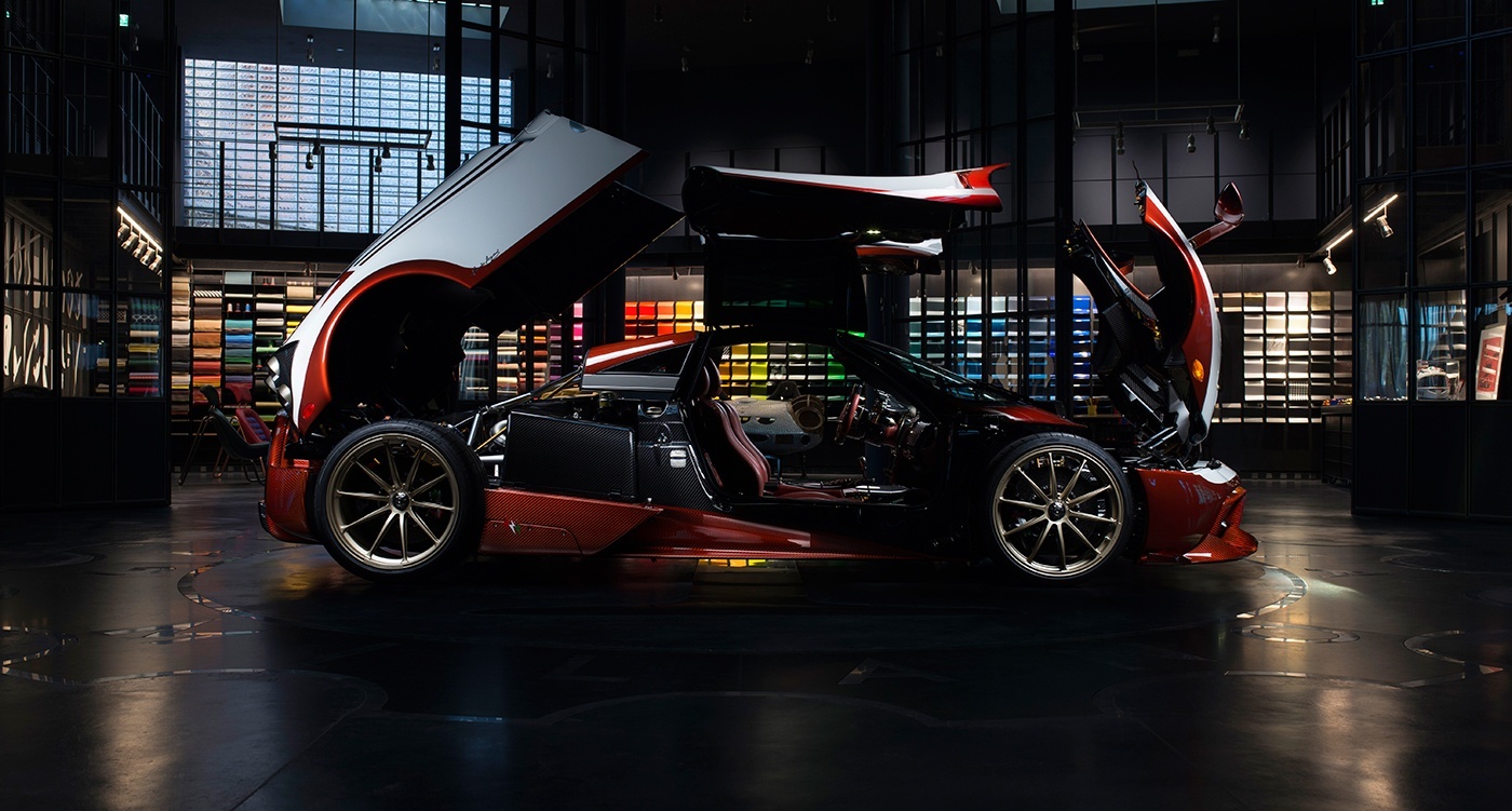 Beneath the beautiful red shade, the carbon fiber bodywork is noticeable, and that’s not all, because the Pagani Huayra Lampo has welcomed additional parts made from the same lightweight material that were borrowed from the Huayra BC. It also has larger air intakes at the front.