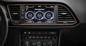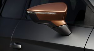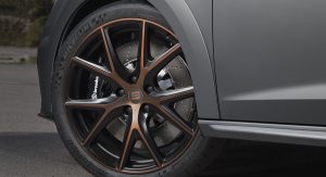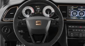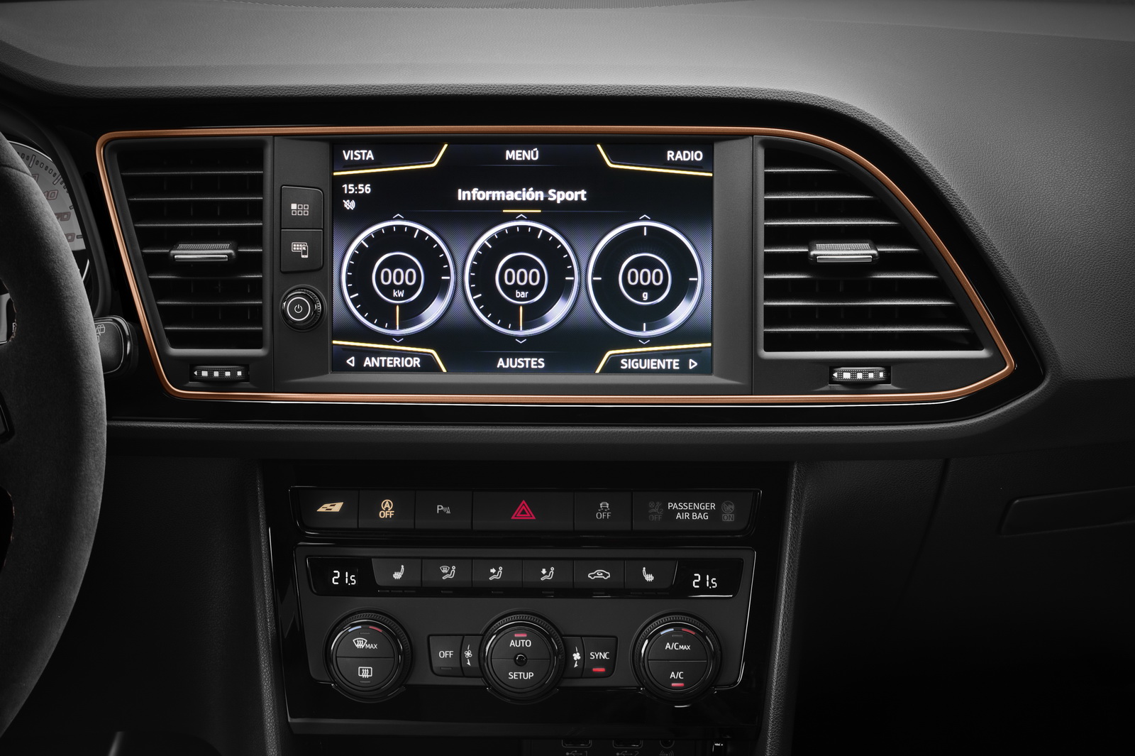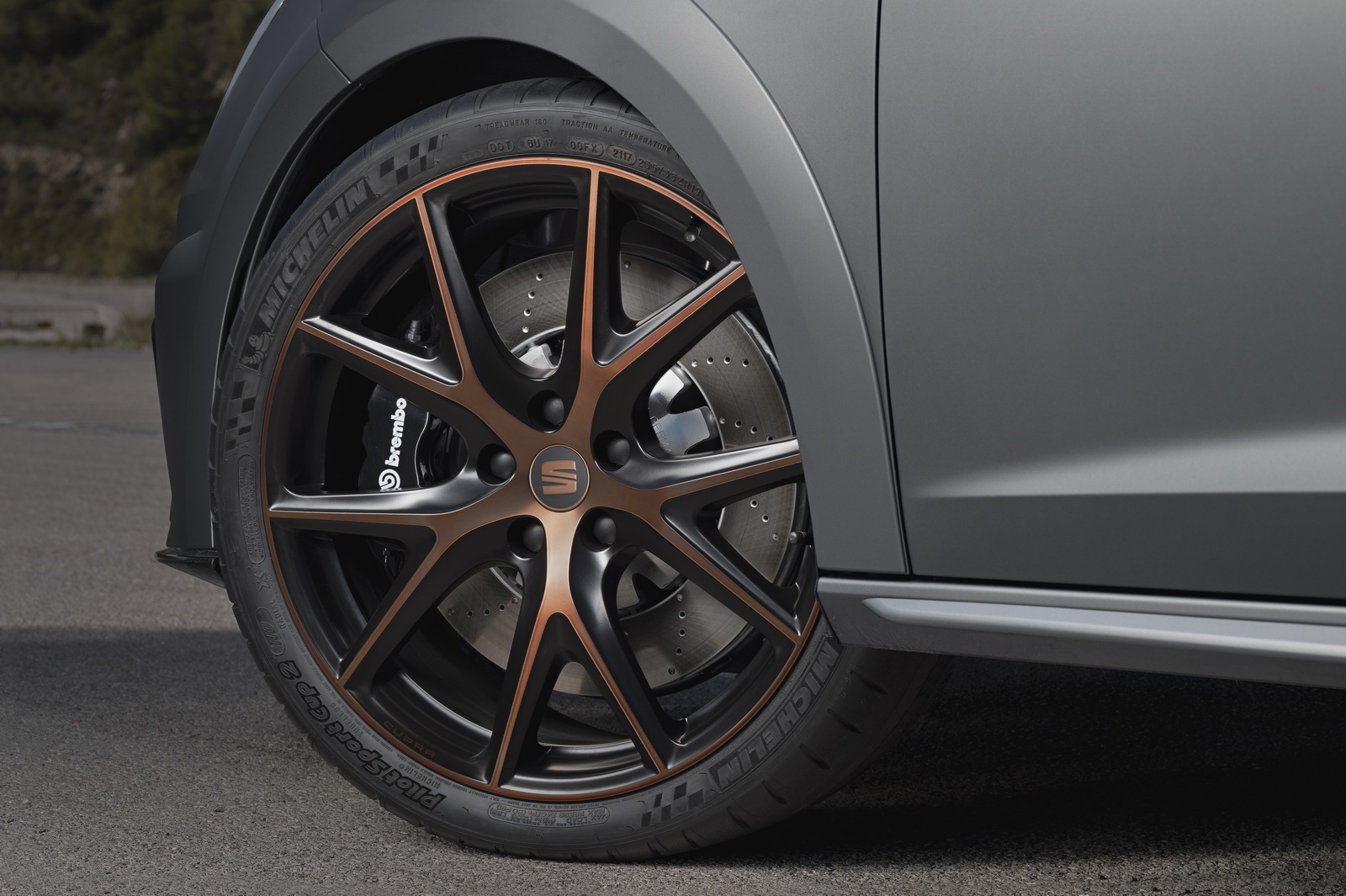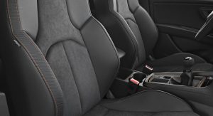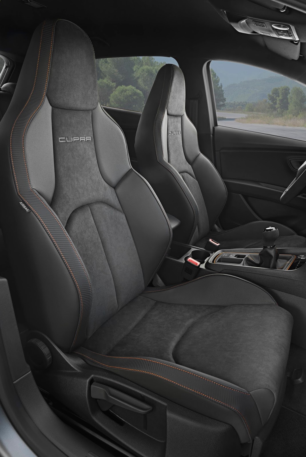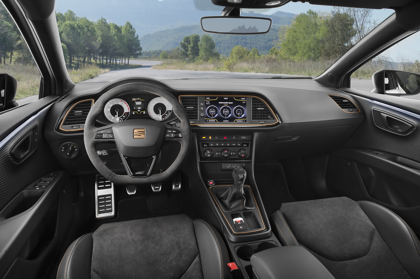 Aside from the obvious fender extensions, the Leon Cupra R can be distinguished by its copper details and the new aero kit, which is made from carbon fiber and includes new front splitter, rear wing, side skirts and the rear diffuser. Seat claims an improvement in aerodynamic efficiency by 12.5 percent compared to the standard Cupra. The interior has also been upgraded with copper details on the dashboard, the console and the air condition trim pieces, Alcantara on the steering wheel and gear lever, as well as copper stitching on the bucket seats.