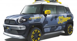 Called the Xbee Winter Adventure, it’s a conceptual version of the retro-rugged compact crossover that Suzuki recently released, and will now exhibit at the Tokyo Auto Salon… complete with blue-grey camo, yellow accents, and roof rack.