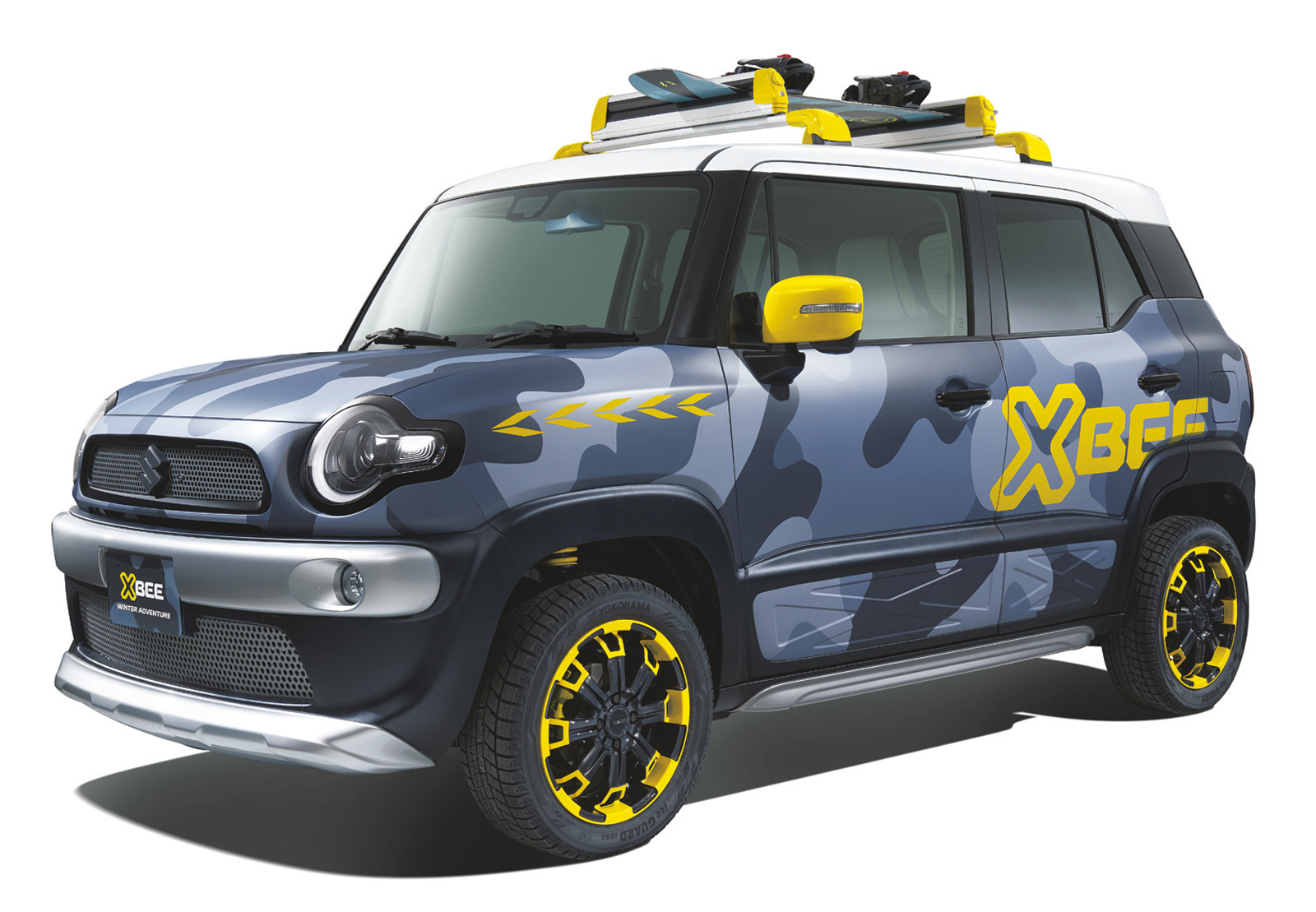 Called the Xbee Winter Adventure, it’s a conceptual version of the retro-rugged compact crossover that Suzuki recently released, and will now exhibit at the Tokyo Auto Salon… complete with blue-grey camo, yellow accents, and roof rack.