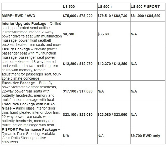 The new Lexus LS starts from $75,995, including a $995 destination and handling fee, making it $3,820 cheaper than the outgoing long-wheelbase model. The hybrid LS 500h has a starting price of $80,505.