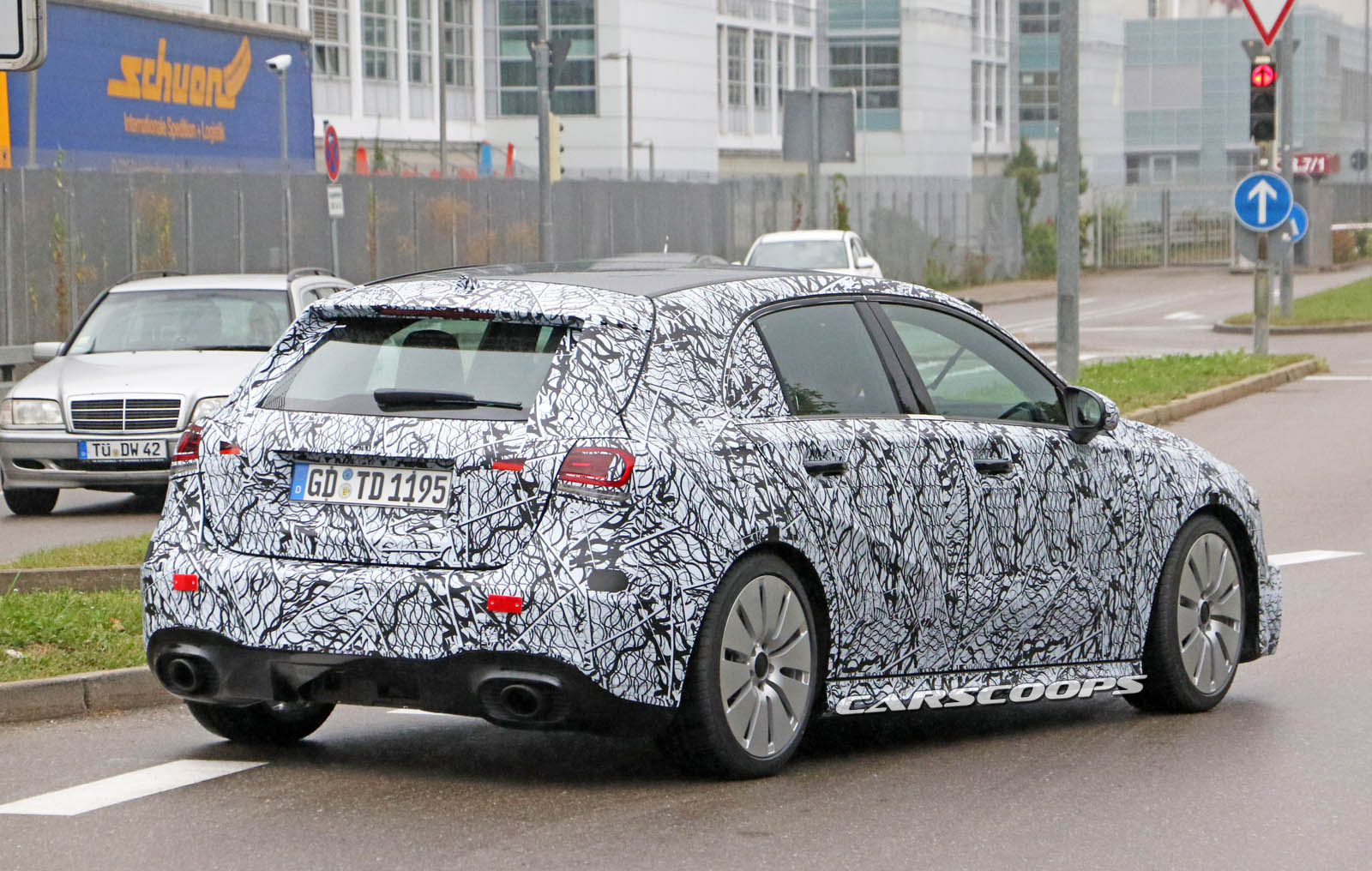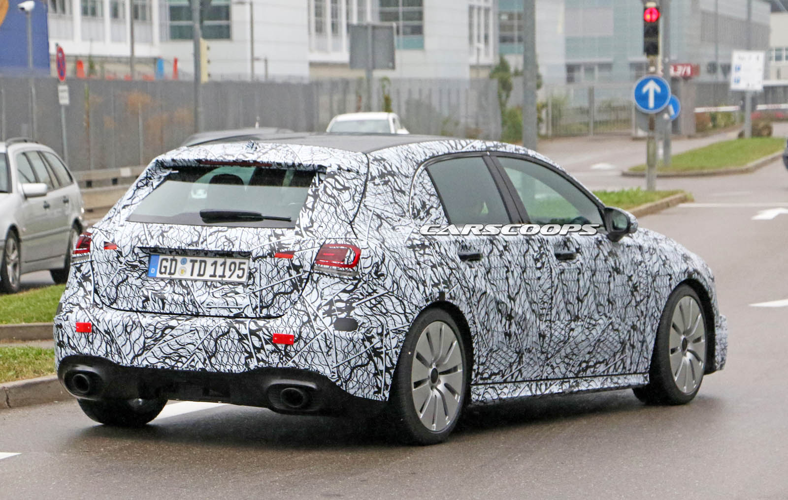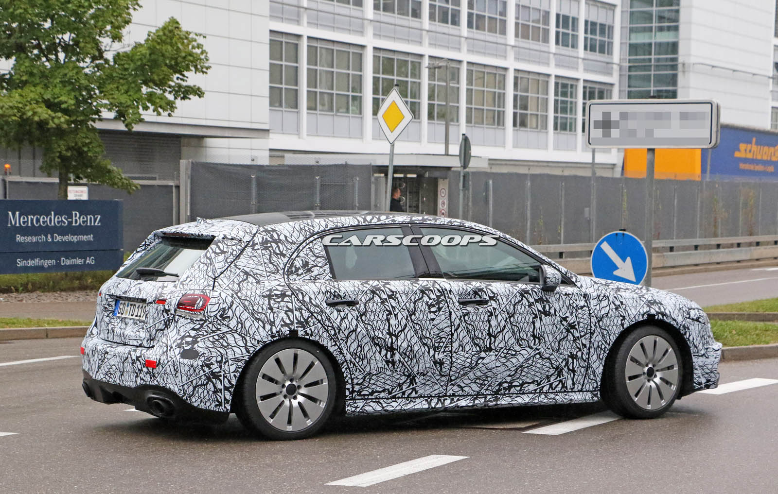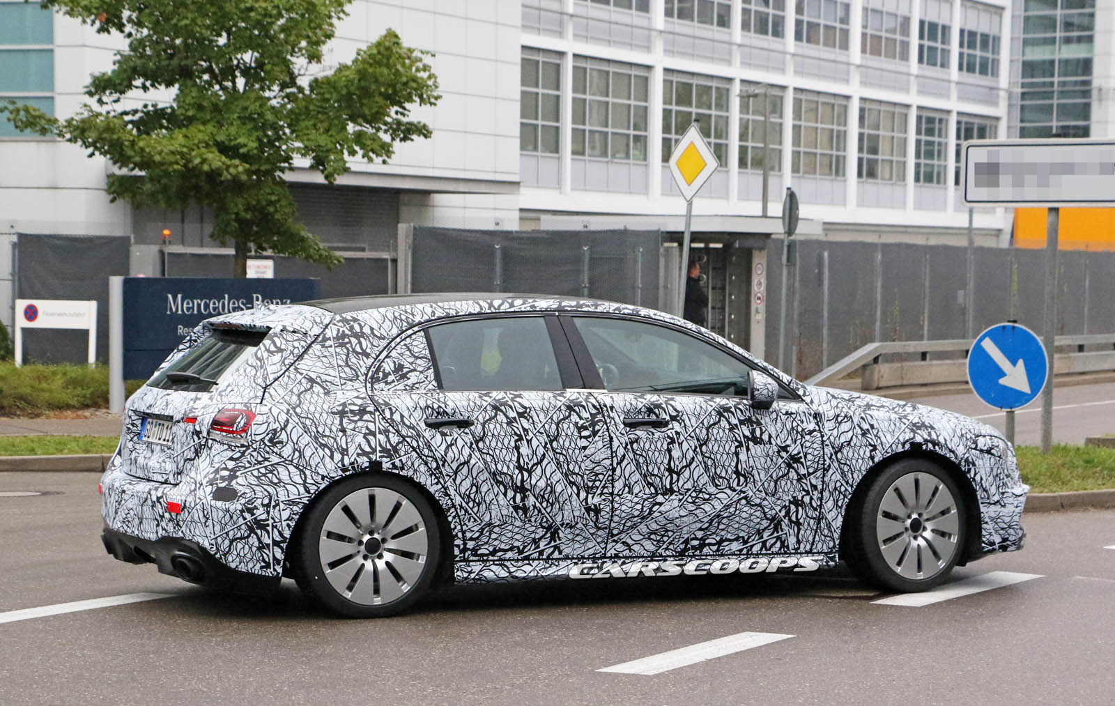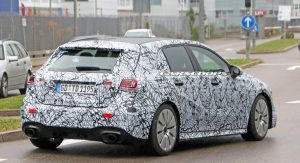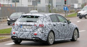 While the new A45 will go up against the Audi RS3, there’ll be an A35 version as well – spotted here while undergoing testing at the company’s headquarters in Sindelfingen, Germany – to target the S3.