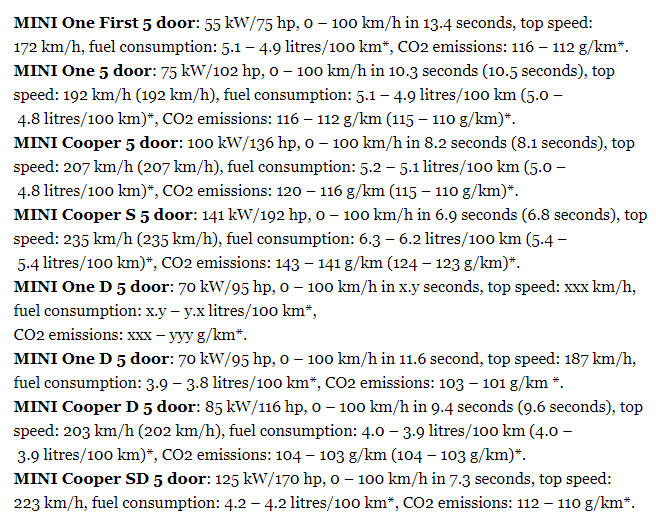 In Europe, the hatchbacks will be offered with seven engines which have outputs ranging from 75 PS (55 kW) to 192 PS (141 kW) in the Cooper S. The MINI Convertible offers six engines and the base unit is rated at 102 PS (75 kW). Depending on which engine is selected, it can be paired to a six-speed manual transmission, a seven-speed dual-clutch automatic, or an eight-speed automatic.