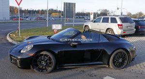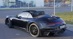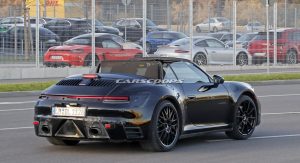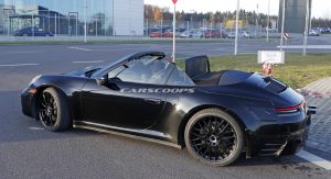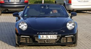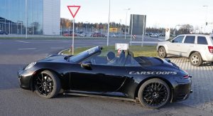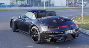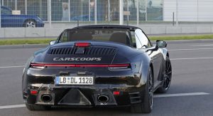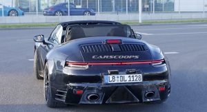 Since this prototype is a convertible, we should mention that its “rear hunch” is somewhat similar to that of previous models, although the body panels are different. It’s also possible that the edge of the rear-end light strip won’t reach as far forward towards the fender as it did on the 991 – but we’ll need the camouflage to come off in order to confirm this theory.